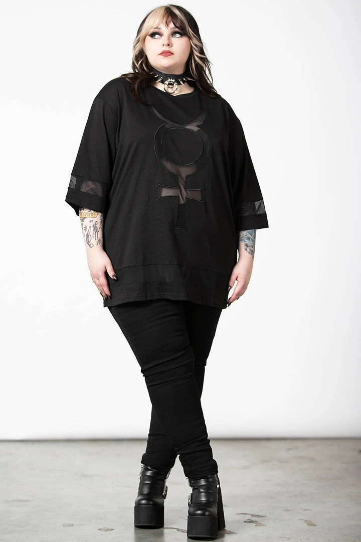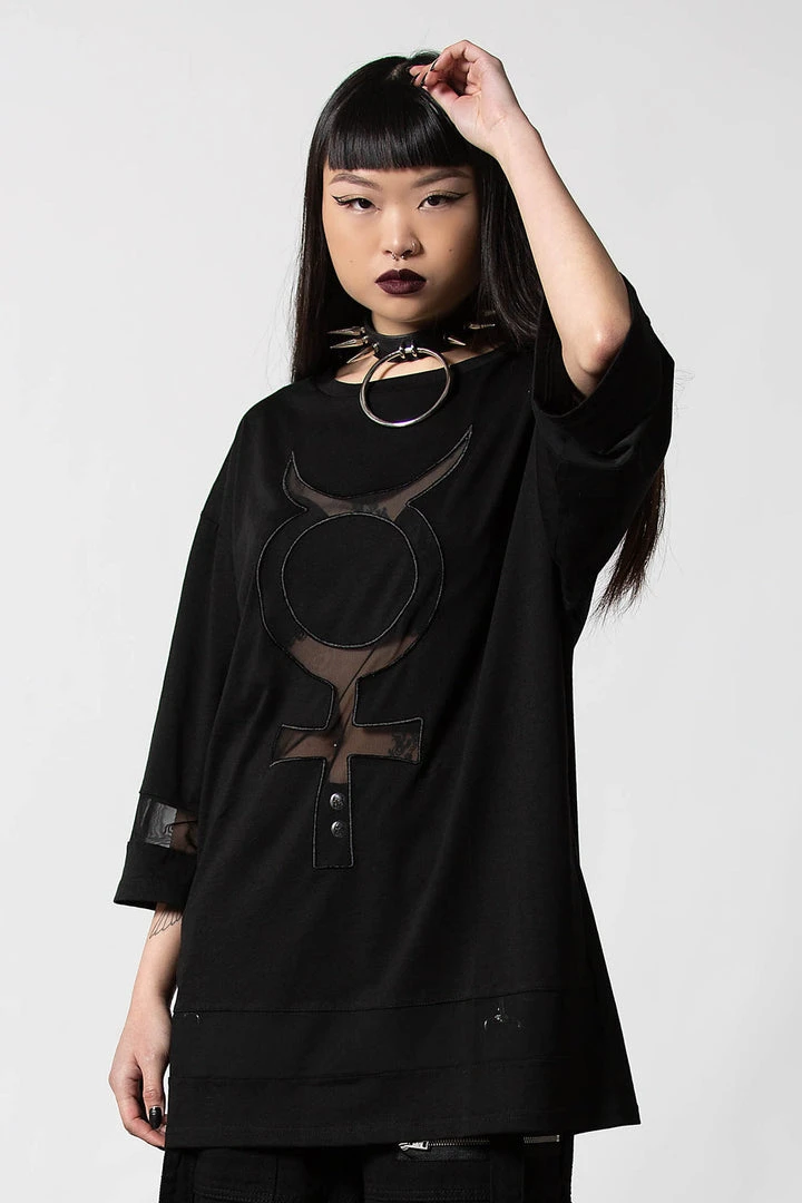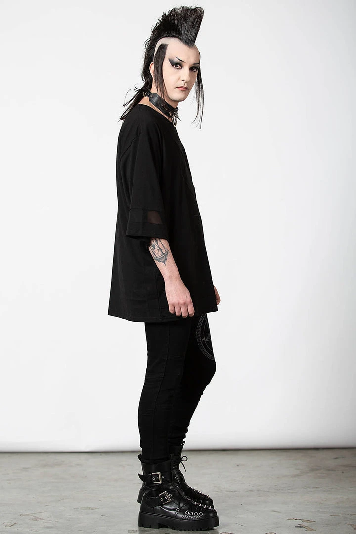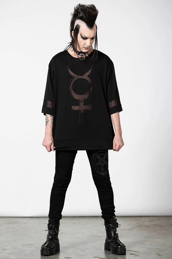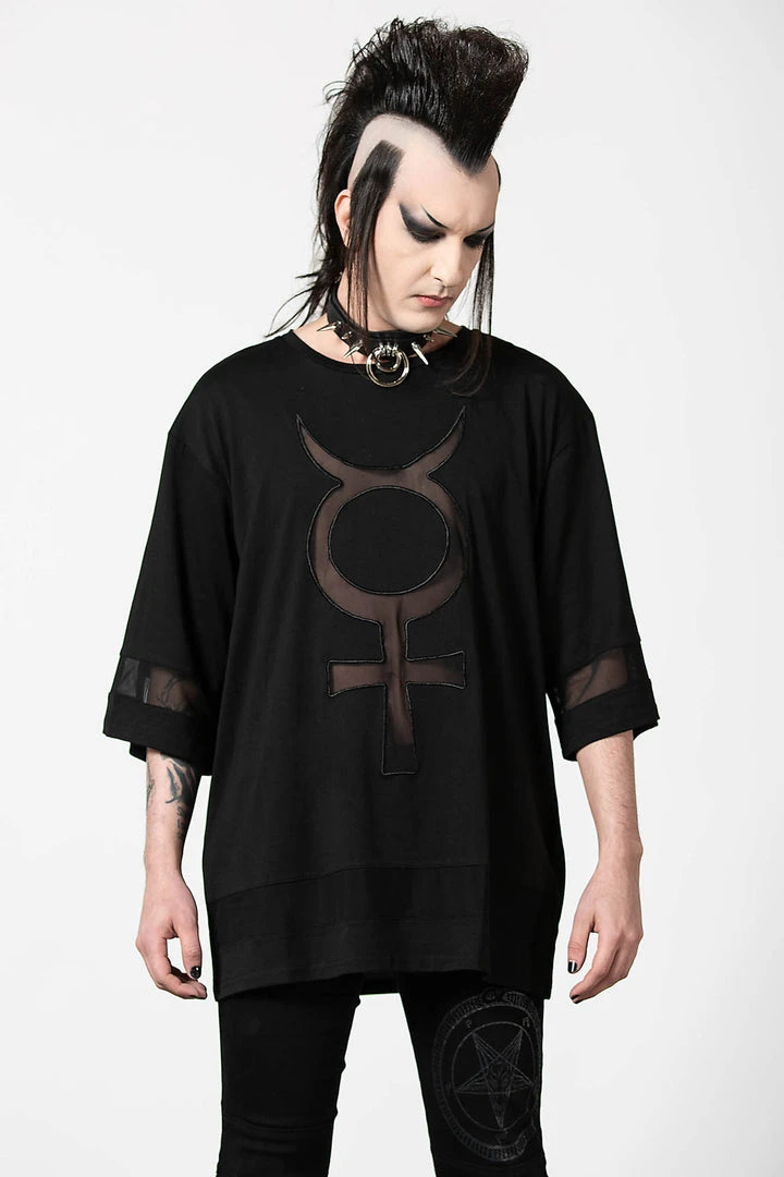 Essential black hockey top from Killstar. This stunning mid length sleeved top is made from a soft cotton jersey fabric with a relaxed fit that looks great on everyone. This amazing longline t-shirt has a statement mercury glyph mesh cut out and can be worn a size up for an oversized look. Stylish and comfortable, looks amazing whatever you pair it with!