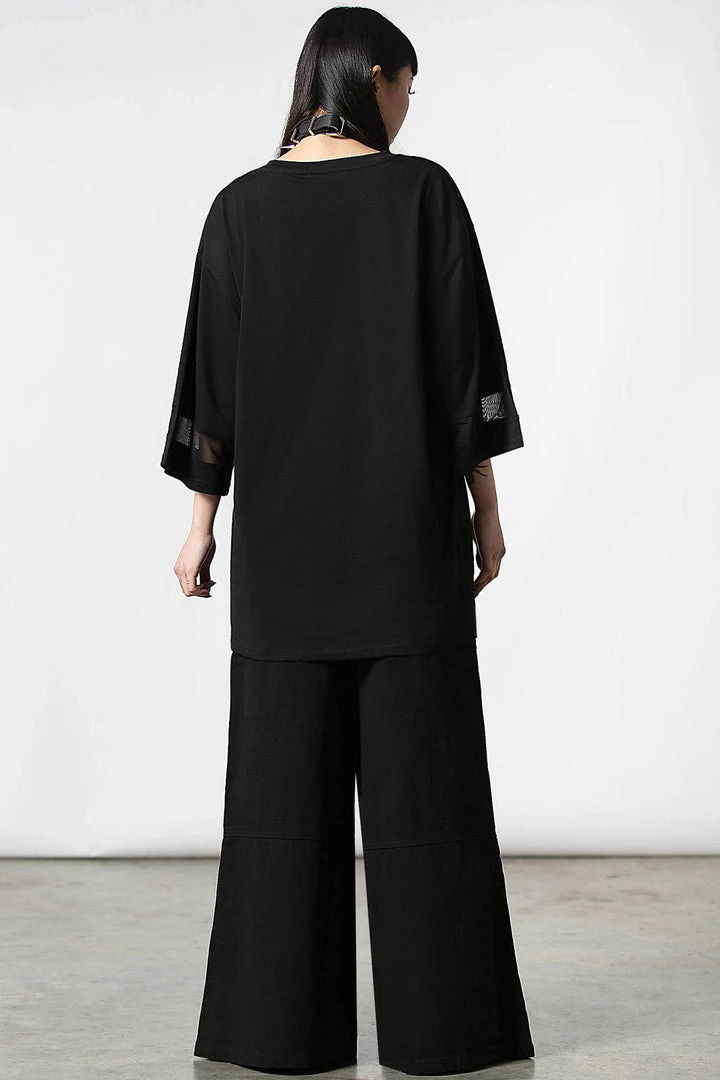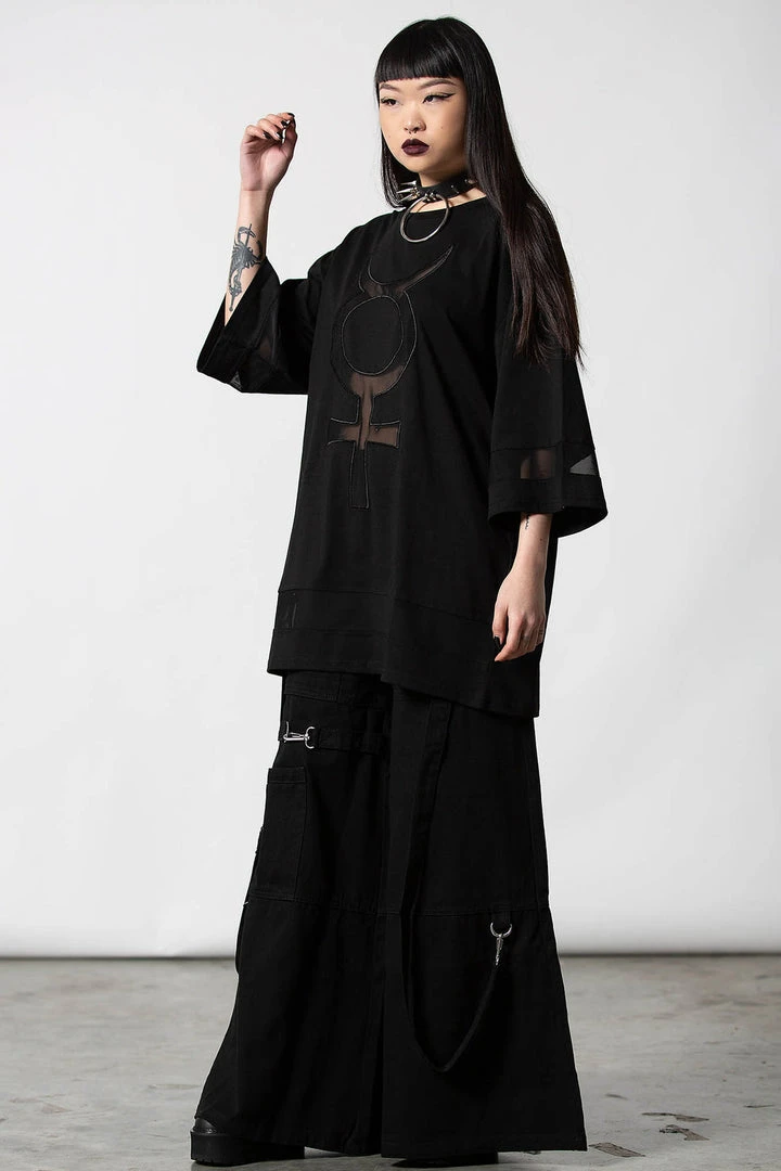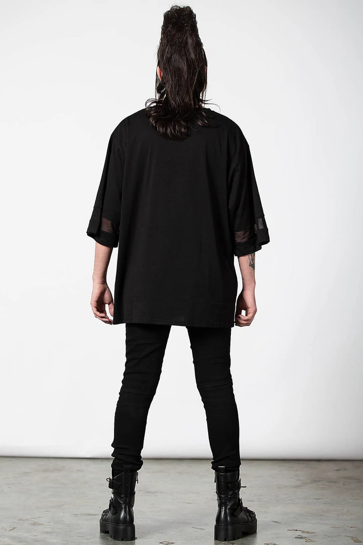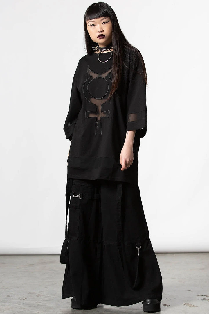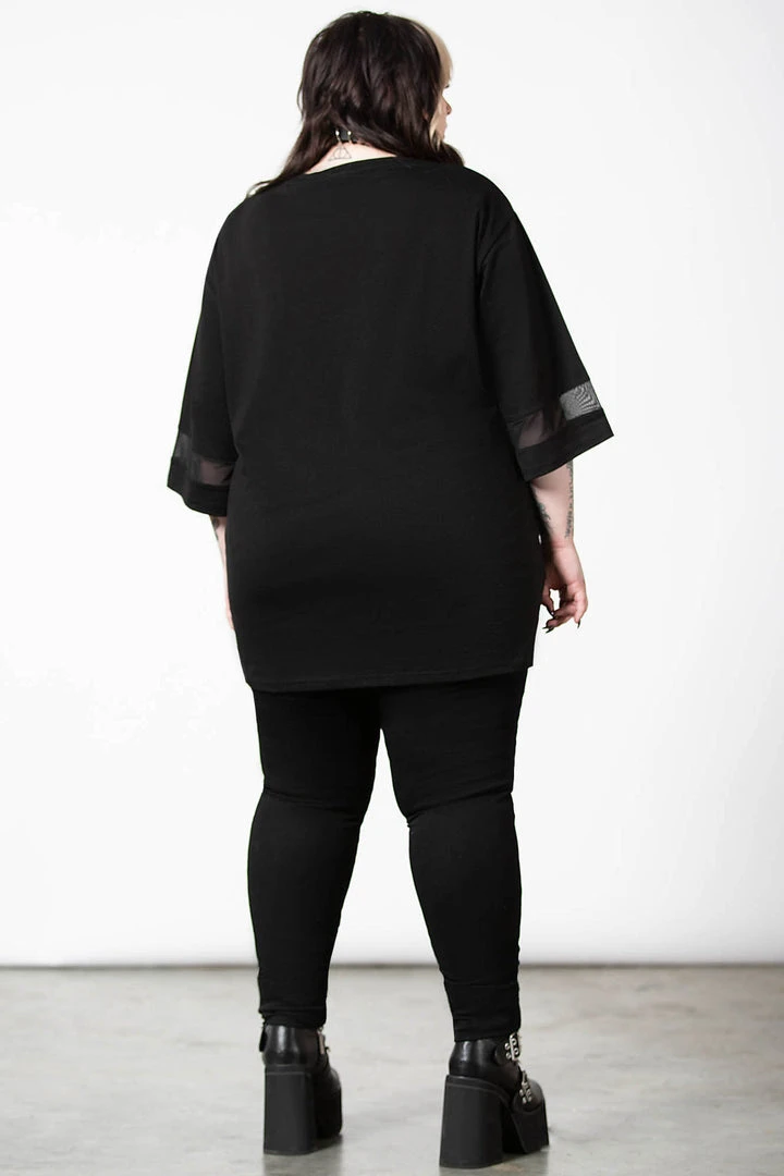 Essential black hockey top from Killstar. This stunning mid length sleeved top is made from a soft cotton jersey fabric with a relaxed fit that looks great on everyone. This amazing longline t-shirt has a statement mercury glyph mesh cut out and can be worn a size up for an oversized look. Stylish and comfortable, looks amazing whatever you pair it with!