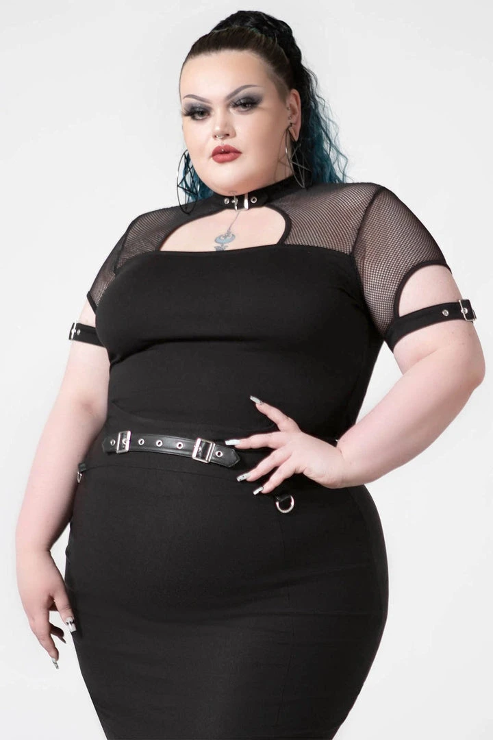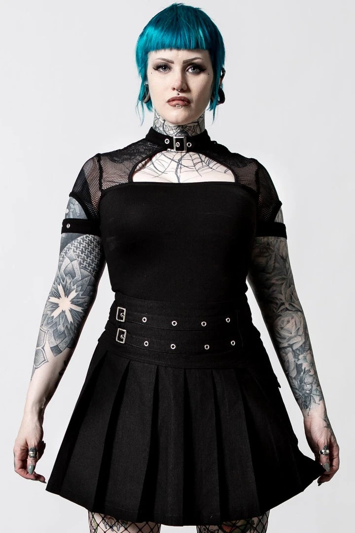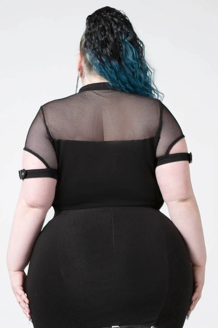 This gorgeous black short sleeve top from Killstar is made from a soft stretchy jersey and mesh fabric that are fitted to flatter your figure. This sexy mesh top features a high neck with cut out detail, short sleeves and buckle accents!
