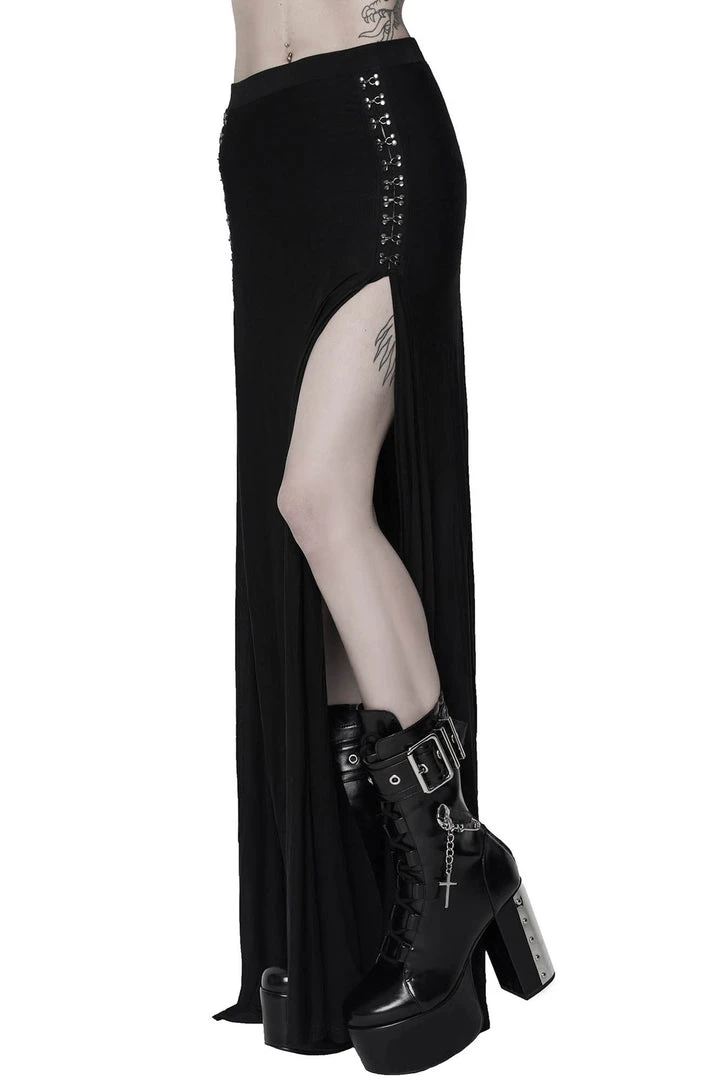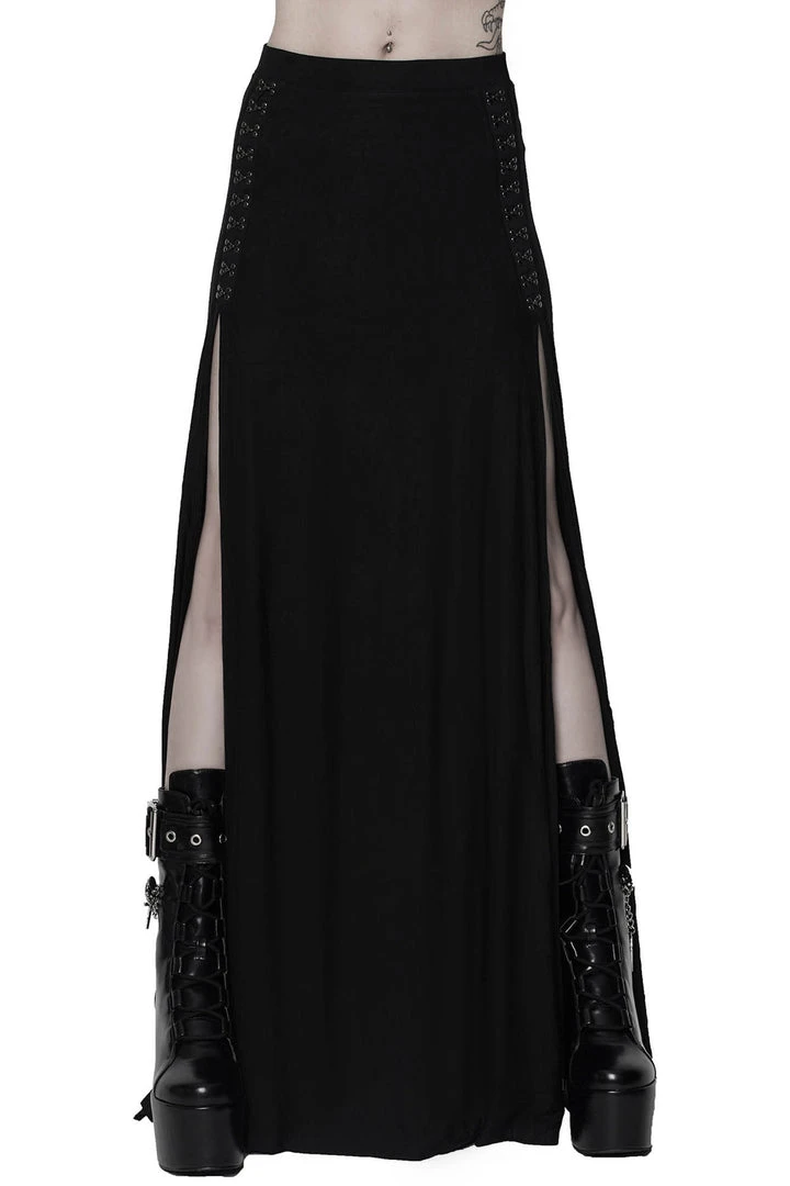 Dramatic extra long maxi skirt from Killstar with an elastic waist. It features high slits with hook and eyes above.