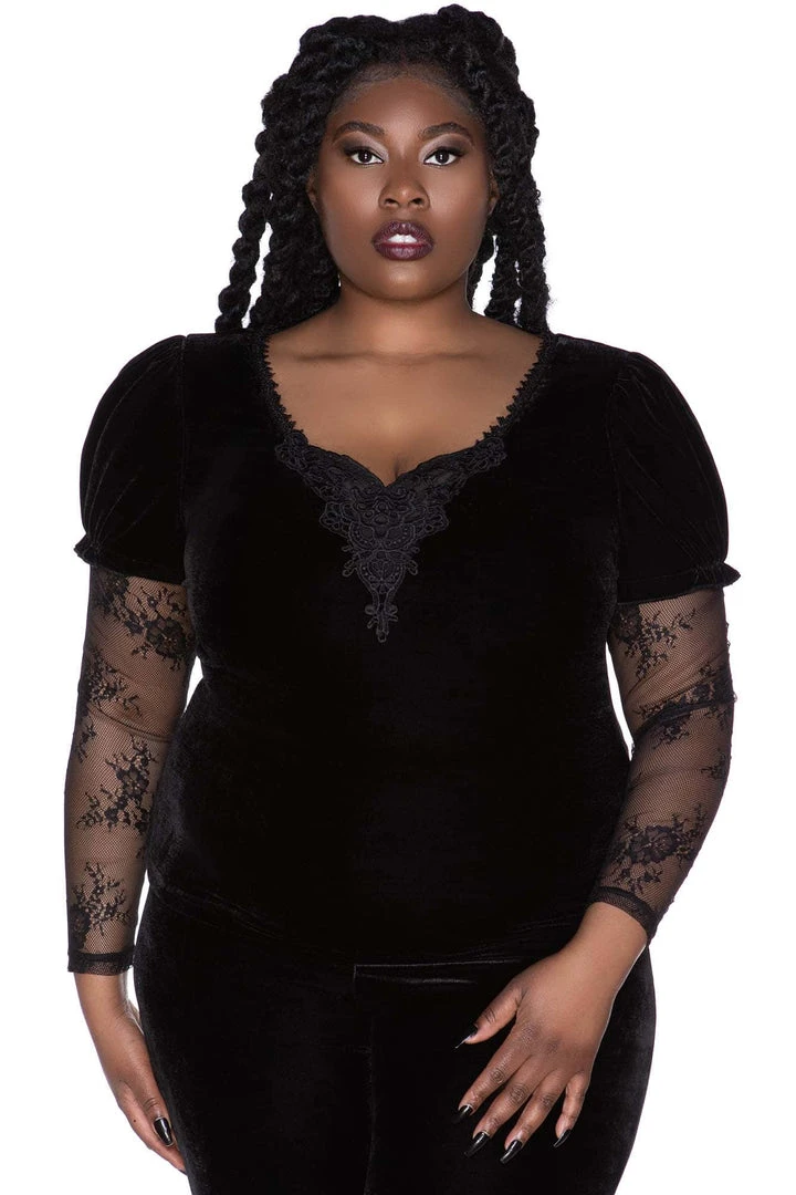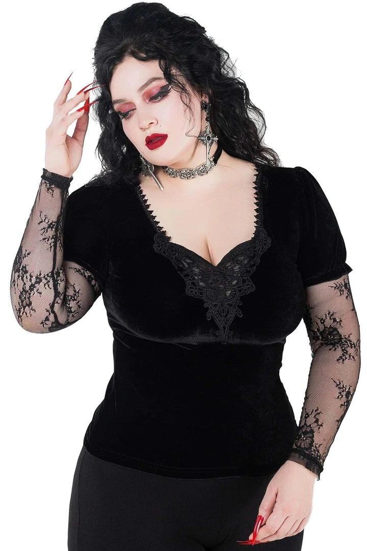Killstar Spirit Bound Long Sleeve Black Top is made from a soft stretch velvet fabric with an elegant black lace contrast. This stunning top is fitted to flatter your figure and features a low neckline, delicate trims and long lace sleeves!