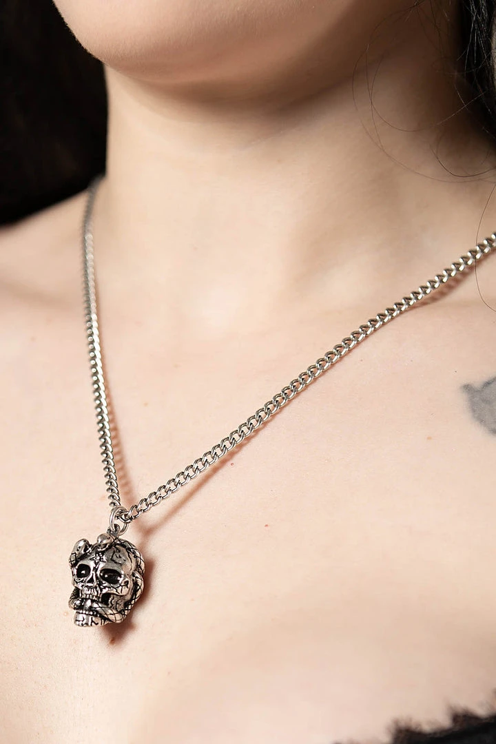 Stunning silver metal skull and snake pendant on a silver metal chain from Killstar that will add an edge to any look! This striking metal skull and snake necklace is exceptional quality with a reinforced design!