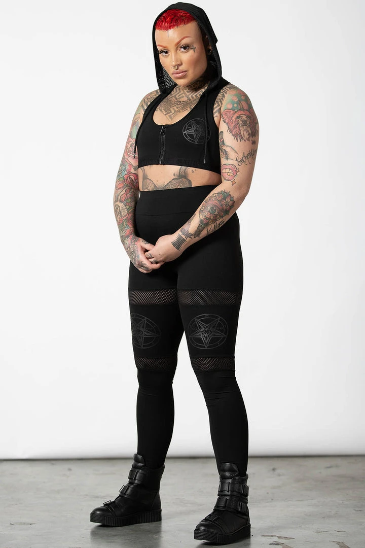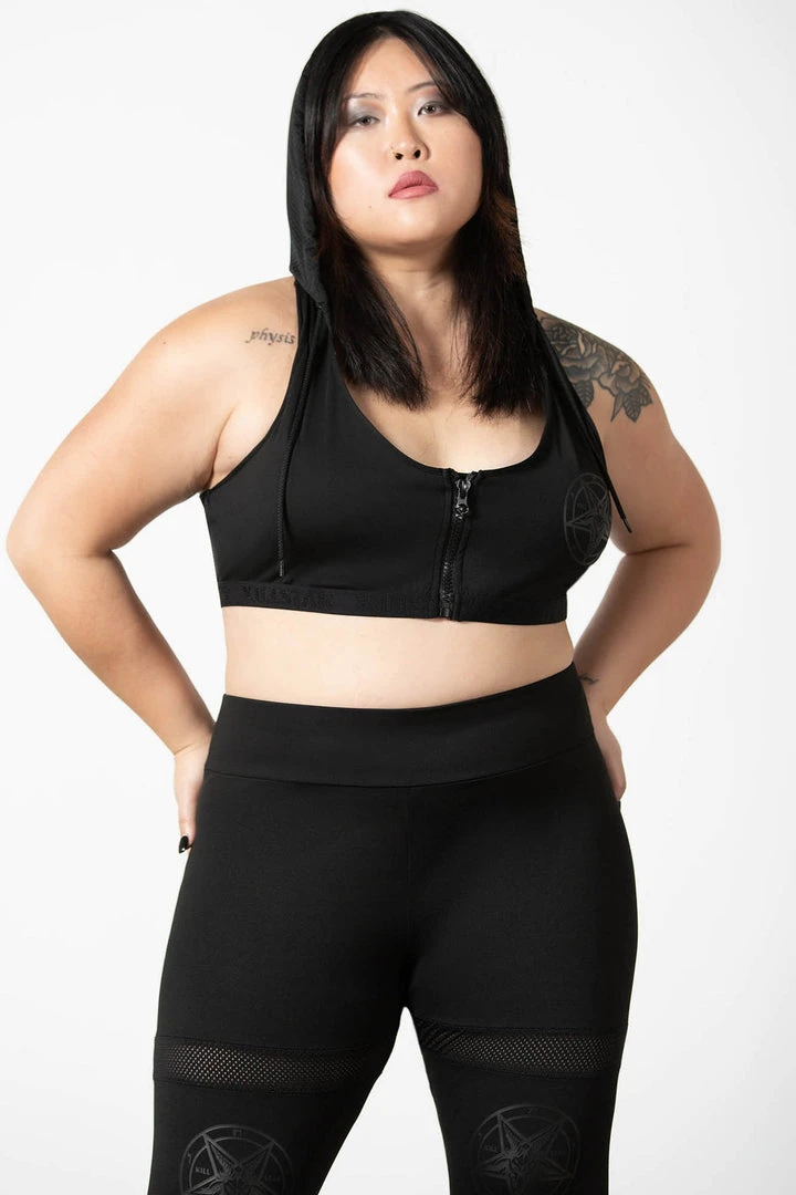 Gorgeous black sports bra from Killstar that is made from a stretchy soft activewear fabric for a great look and perfect fit! Detailing such as the mesh hood, breathable mesh racer back and zip up front make this amazing bra perfect for working out and hanging out! Looks awesome with Killstar Bad Dream shorts.