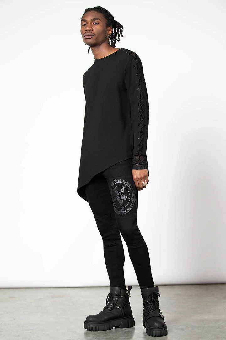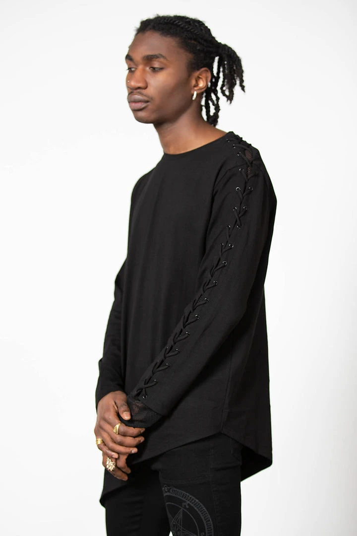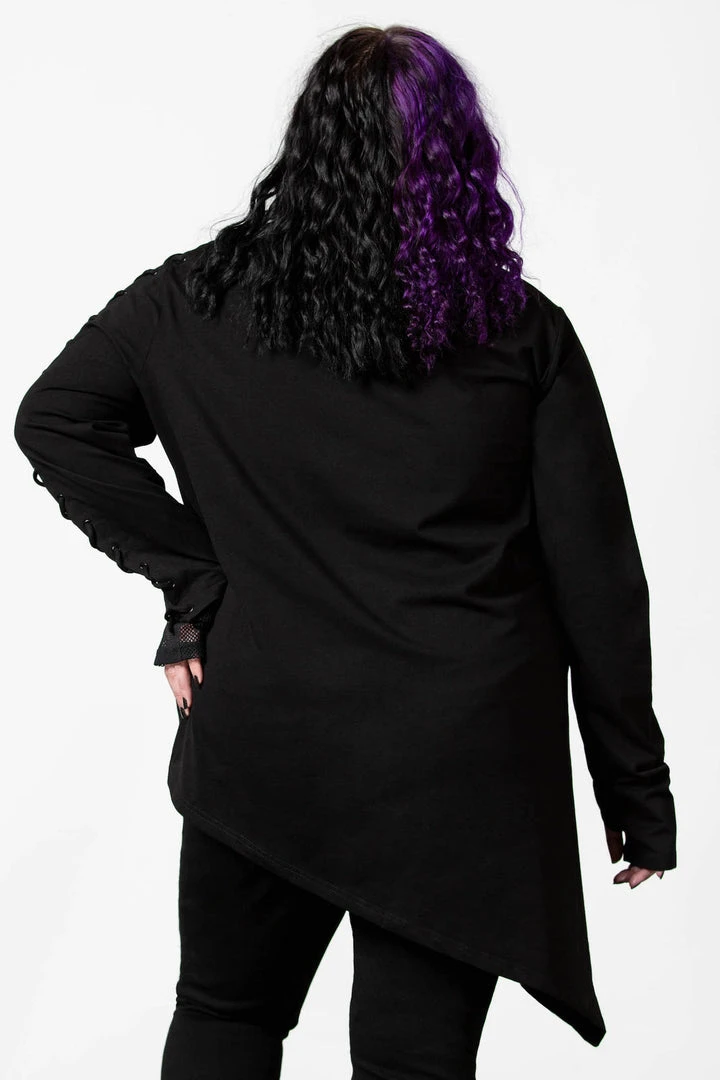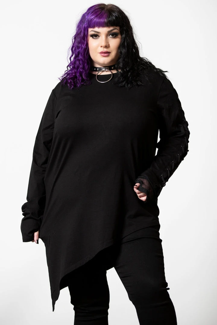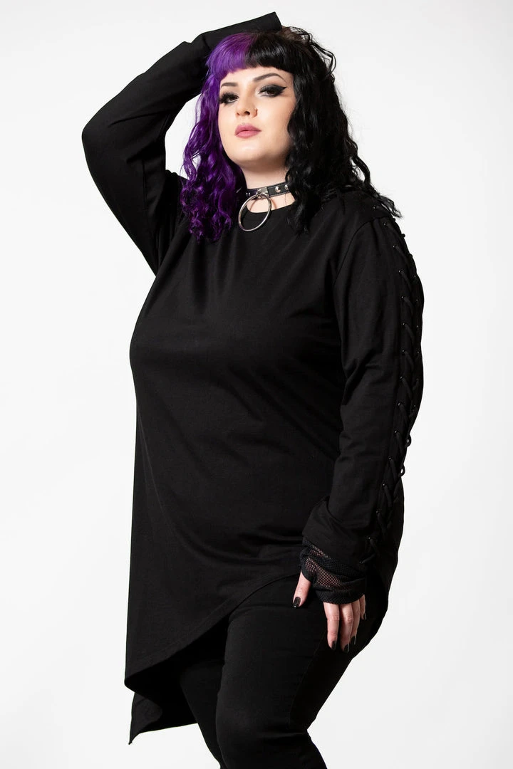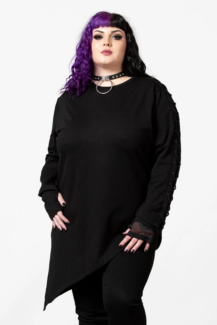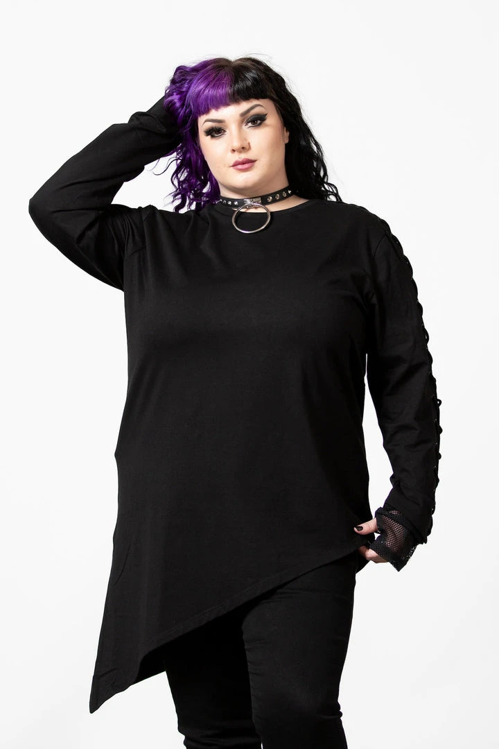 Versatile and stylish black long sleeve top from Killstar made from a soft touch cotton jersey fabric with just the right amount of stretch. This amazing longline shirt features mesh cuffs with thumbholes, asymmetric hem and lace up detailing on the sleeves. This must-have top is designed in a relaxed mens / unisex fit and round neck that looks great on everyone..