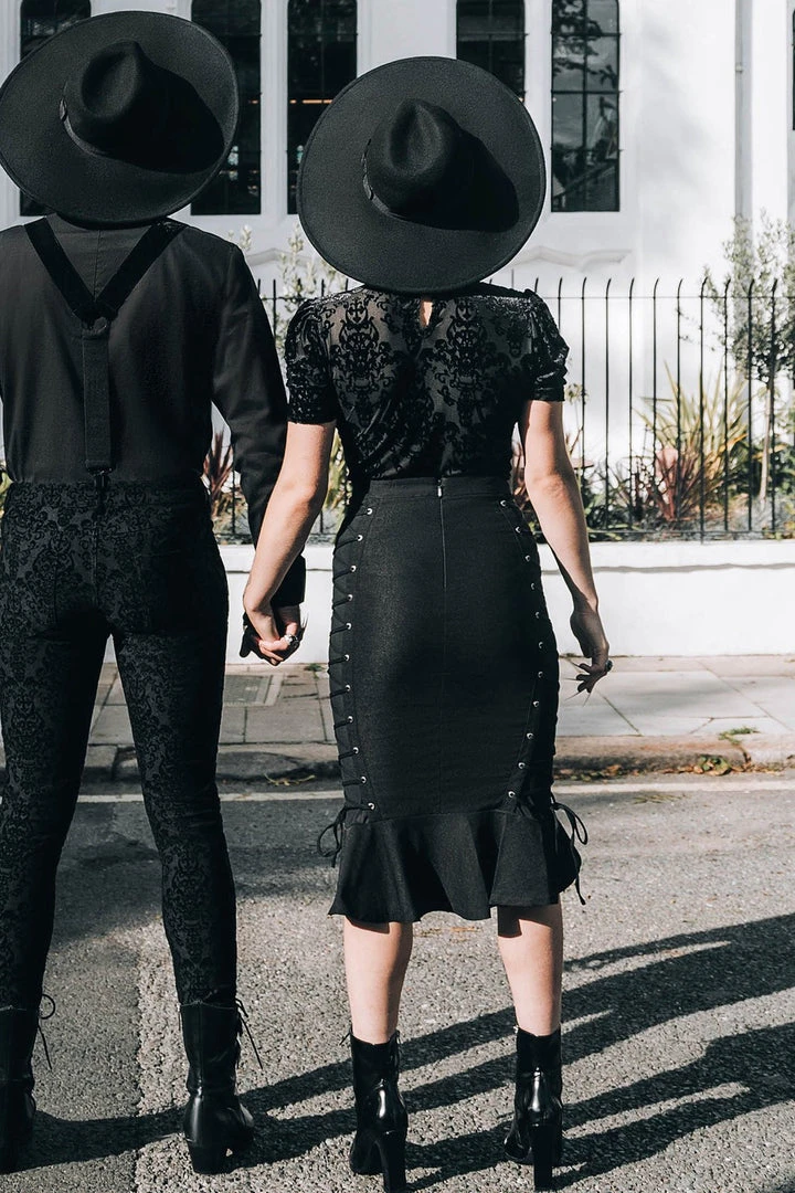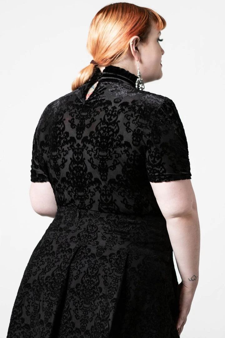 Beautiful black velvet top from Killstar. This stunning blouse is made from a luxury soft stretchy burnout velvet fabric that is fitted to show off your figure. This lovely top features short puff sleeves, high neck and ruffle. Elegant and glamorous, looks amazing whatever you pair it with!