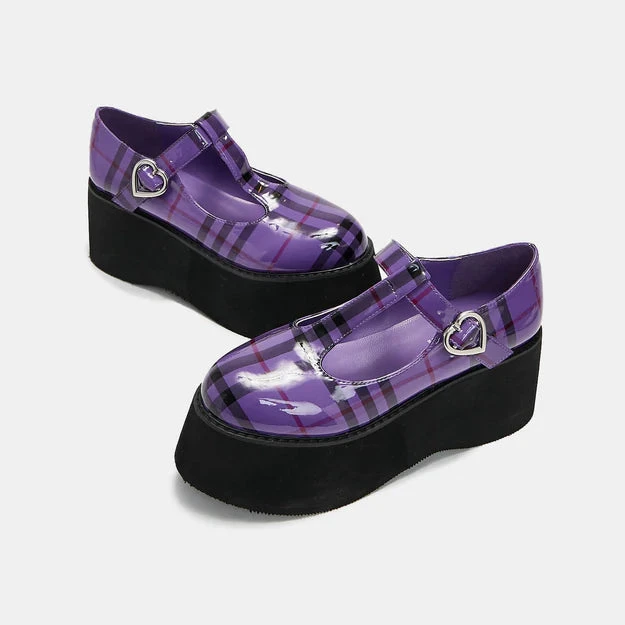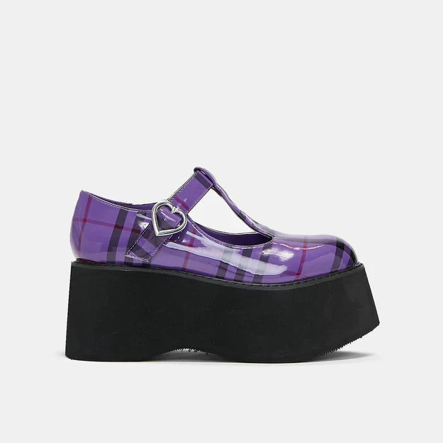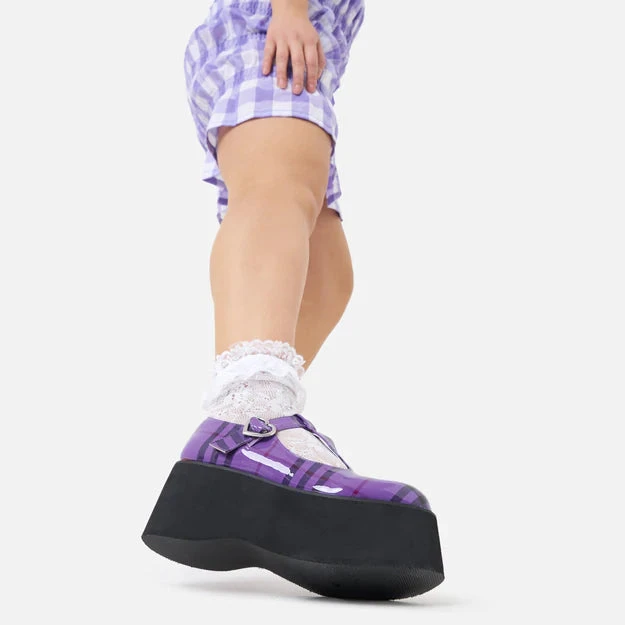 Classic Mary Janes with an epic platform twist by Koi in a gorgeous patent effect purple plaid pattern. Elevate your look with the 3″ platform sole with a lovely metal heart buckle.