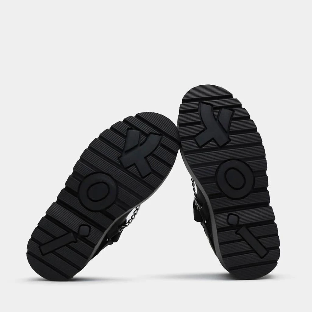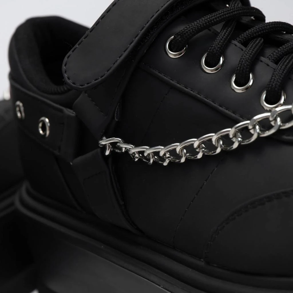 Amazing vegan platform shoe form Koi! These lovely shoes have that bit extra with lace up & velcro strap fastening, chain & spike detailing, eyelet detailing and a 4.5cm platform sole, rising to 5cm at the heel.