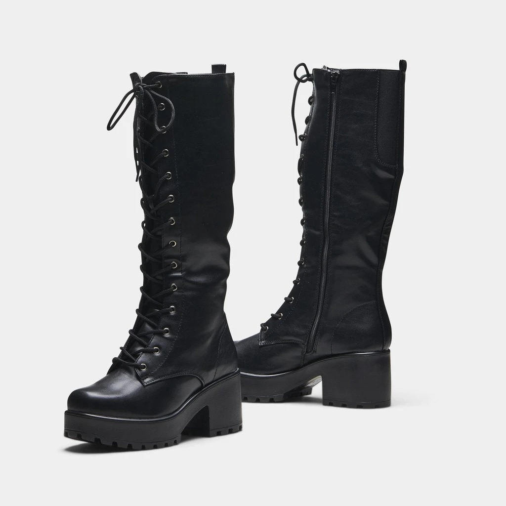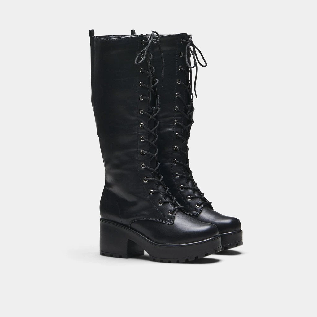 Stomp your way through the season in these chunky platform sole calf high boots from Koi. Featuring a long lace up front with a side zip for an easy take on and off, available here in a classic black.