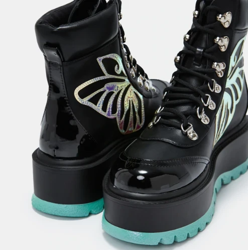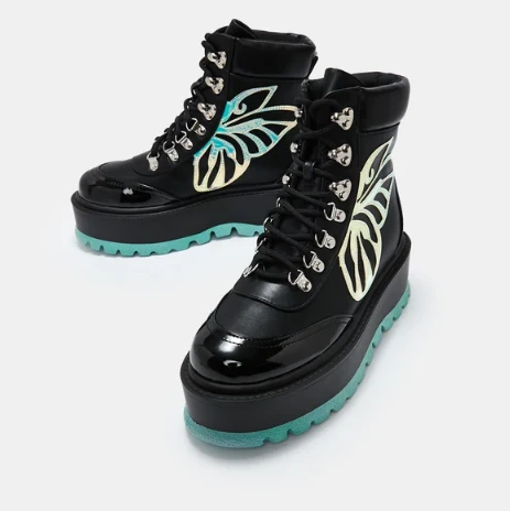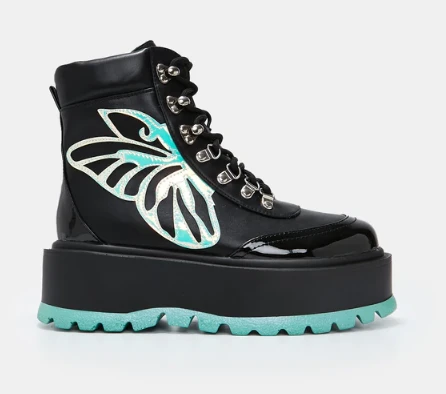 Stunning boots from Koi with their trademark chunky platform sole and faux leather uppers. Contrasting blue wing detail, lace up front and blue trim to the platform sole.