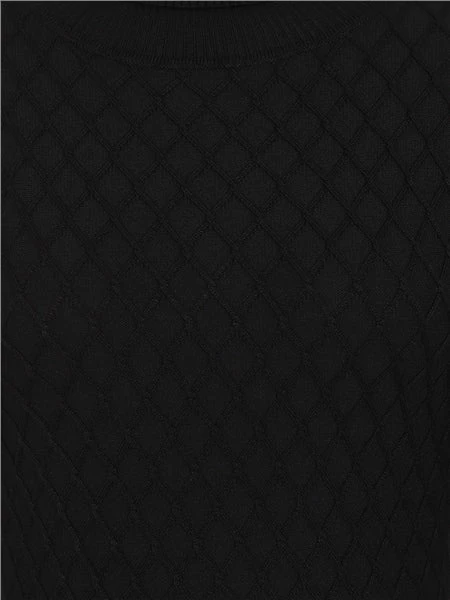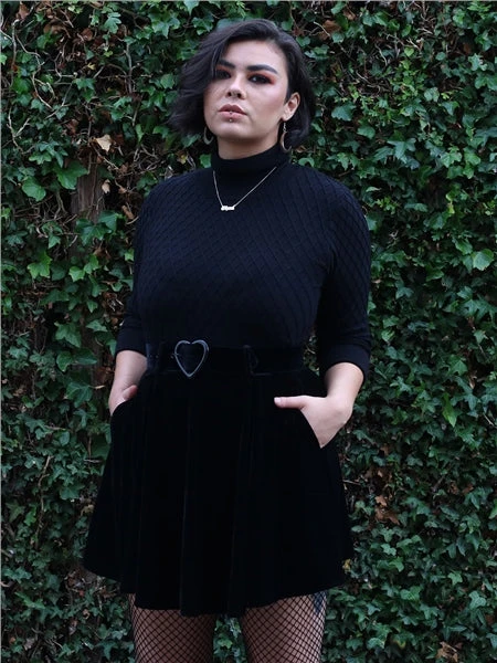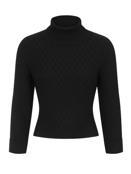 Gorgeous and versatile black roll neck fitted sweater from Collectif. This wardrobe staple is made from a lovely diamond lattice knit fabric with 3/4 length sleeves with elasticated cuffs. This lovely black top will take you from the office to a night out in style!