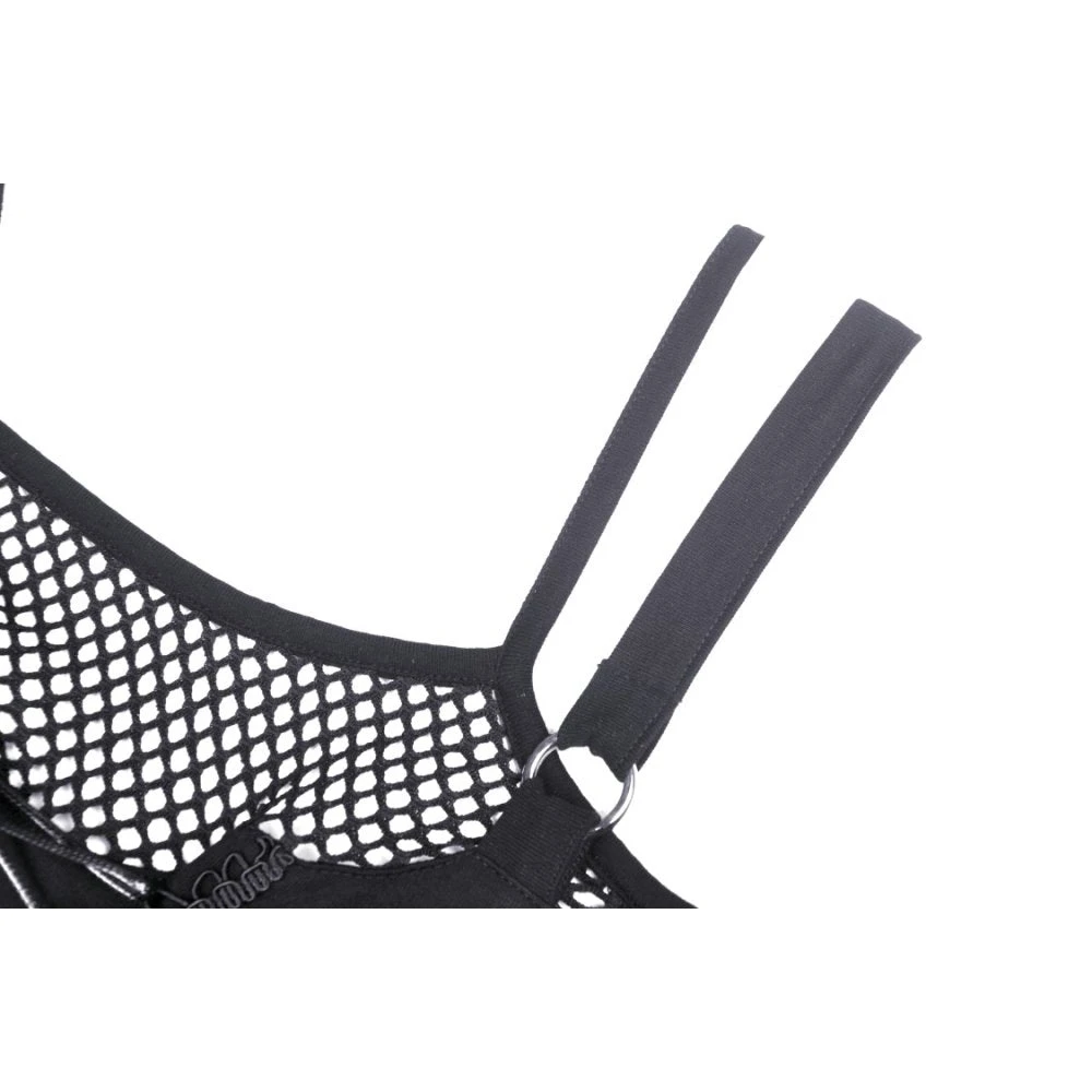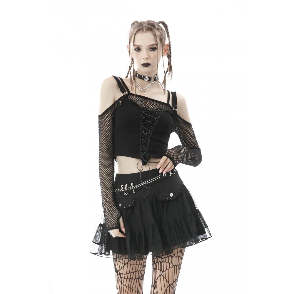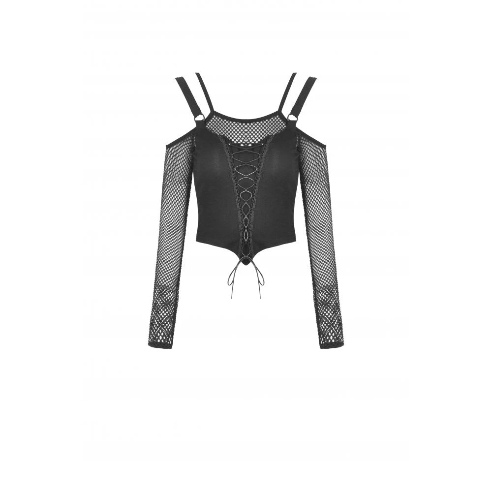 Seductive and stylish black long sleeve top from Dark in Love made from a soft stretchy cotton fabric in a body hugging fit! This versatile and edgy cropped top features a 2 layer effect with fishnet thumbhole sleeves and underlayer and corset style solid body. Looks amazing worn with a skirt or skintight trousers!