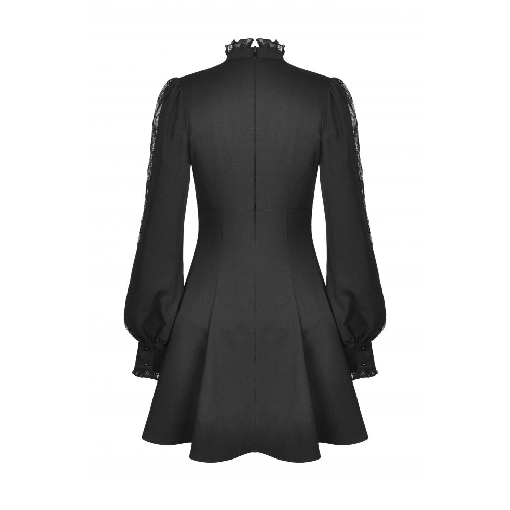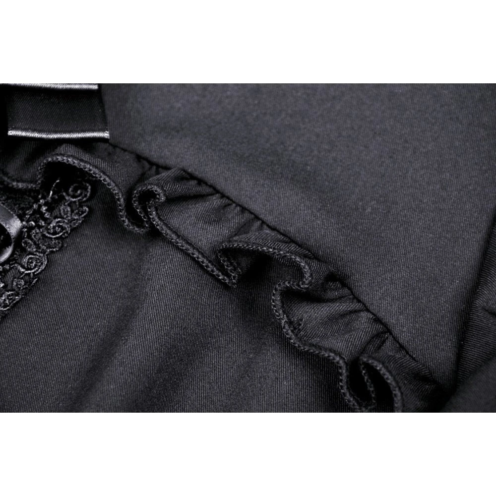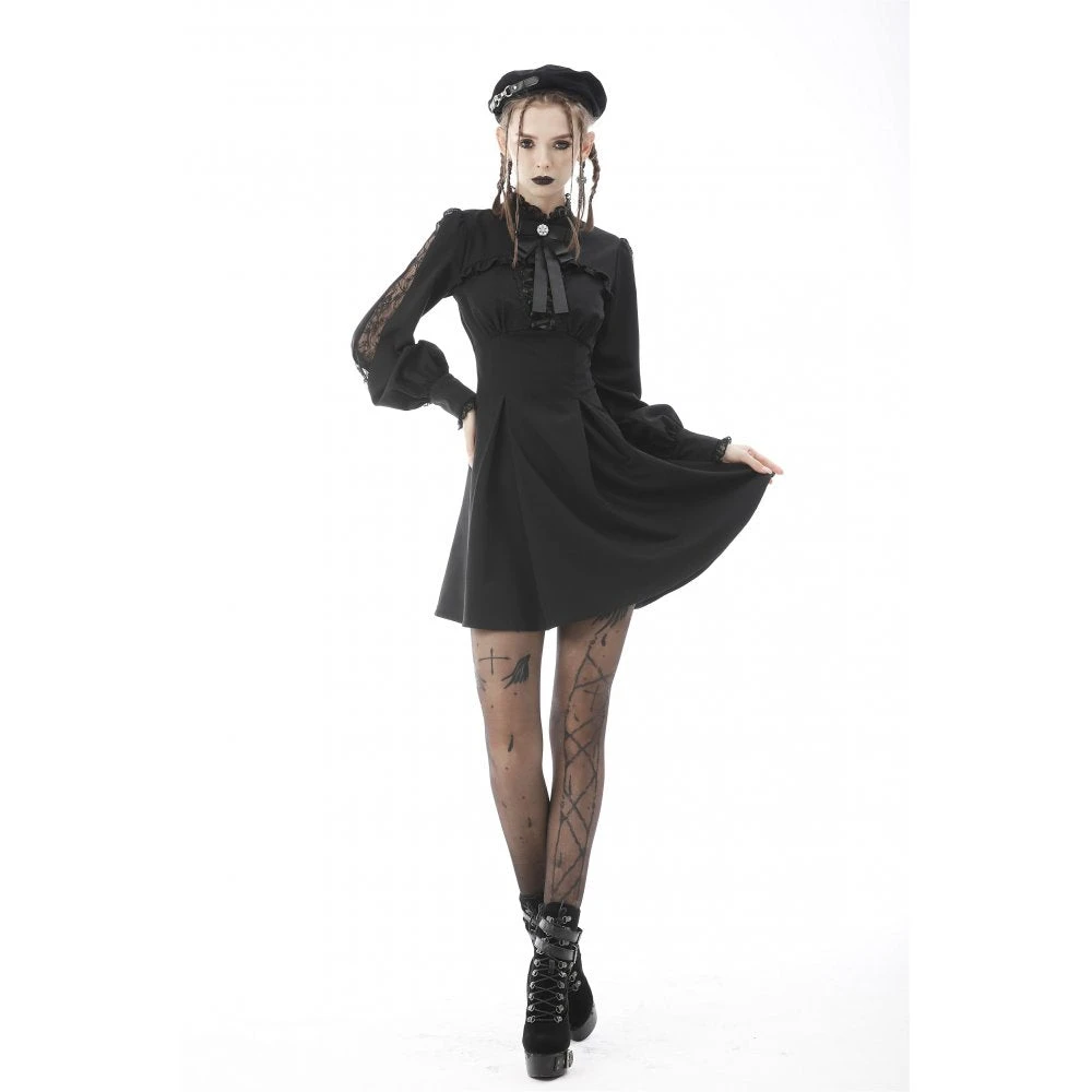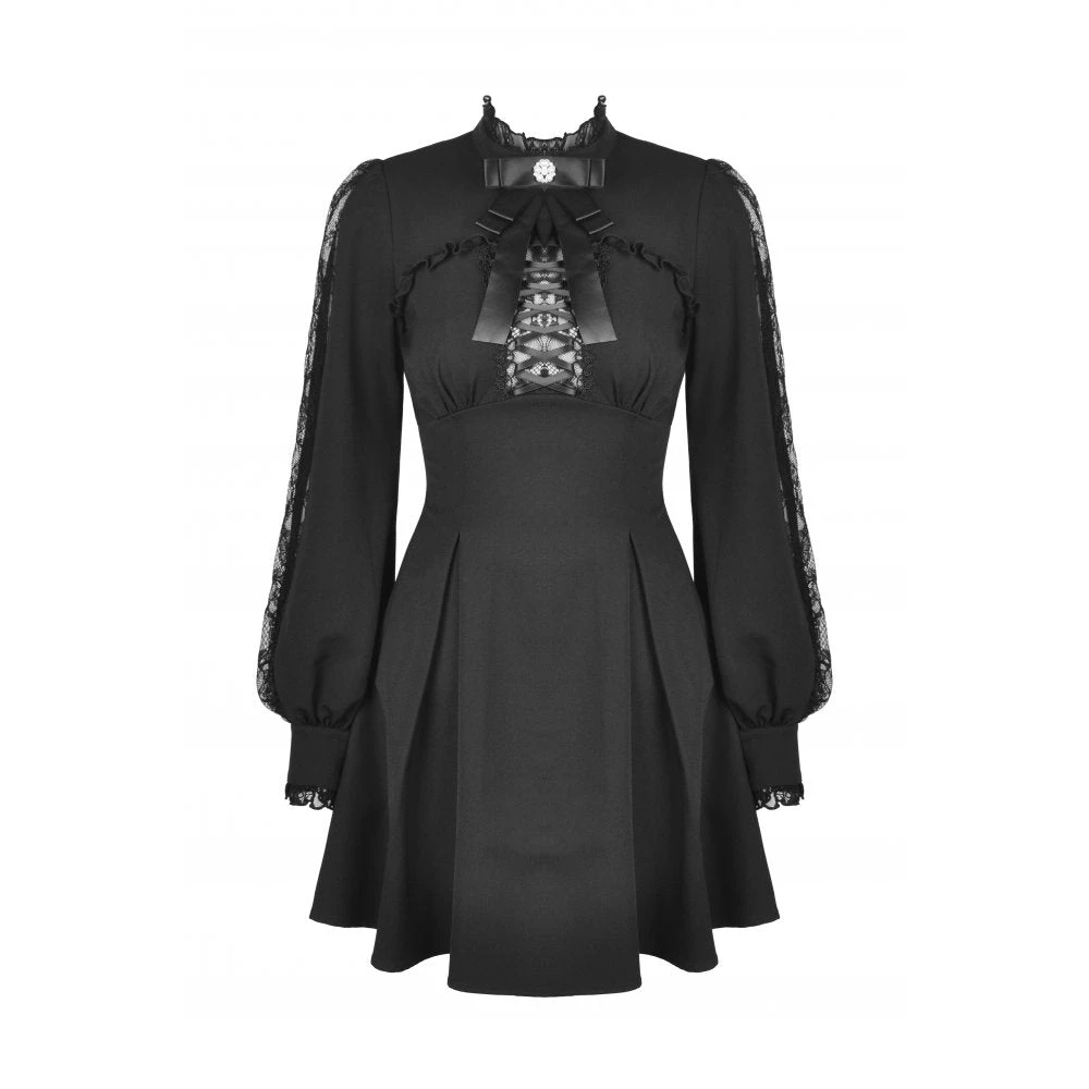 Stunning black long sleeved mini dress with seductive ribbon lace up chest from Dark in Love. This elegant yet seductive gothic mini dress features a flowing skirt, gathered in waist, and high neckline with ribbon bow and pearl details! The long sleeves features lace panels, button up cuffs and delicate lace edging. Looks amazing on!