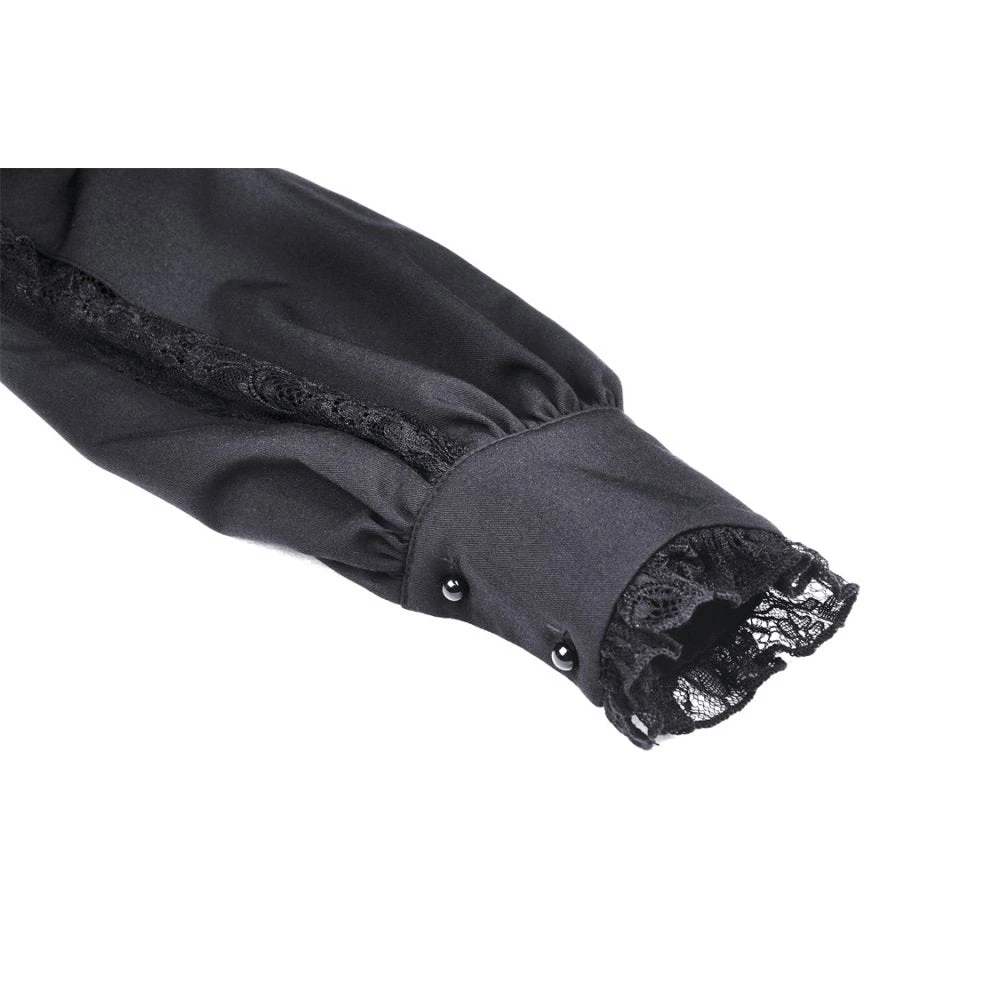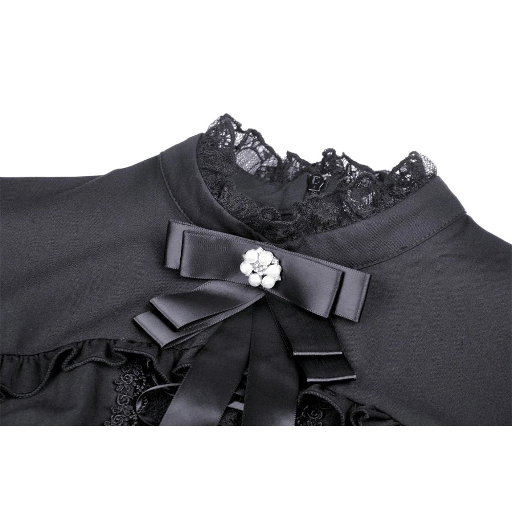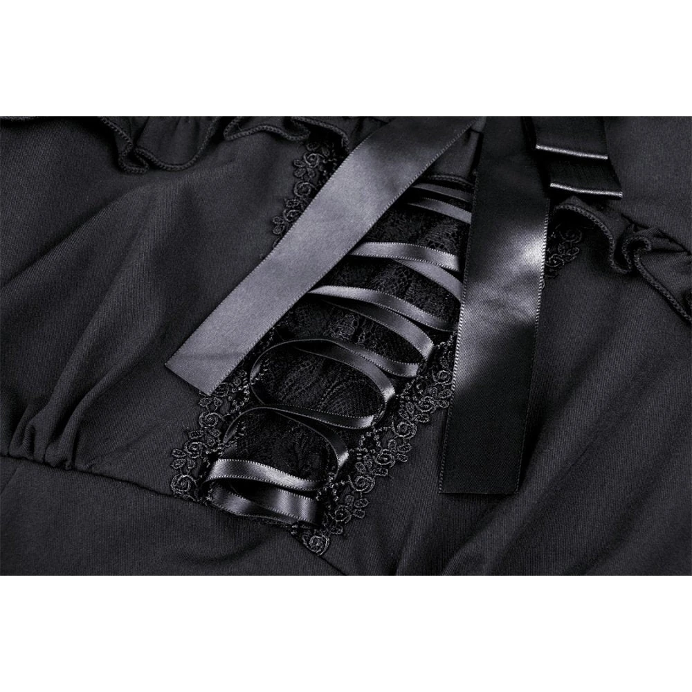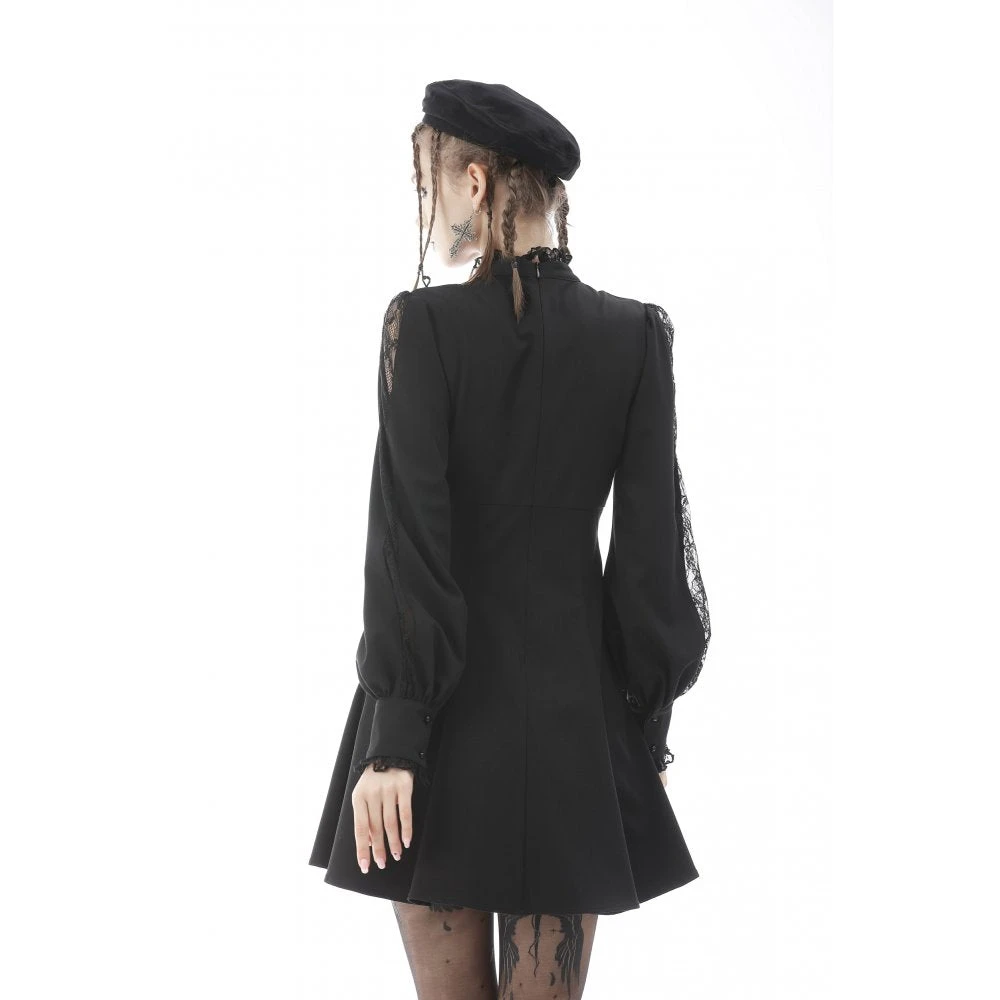 Stunning black long sleeved mini dress with seductive ribbon lace up chest from Dark in Love. This elegant yet seductive gothic mini dress features a flowing skirt, gathered in waist, and high neckline with ribbon bow and pearl details! The long sleeves features lace panels, button up cuffs and delicate lace edging. Looks amazing on!