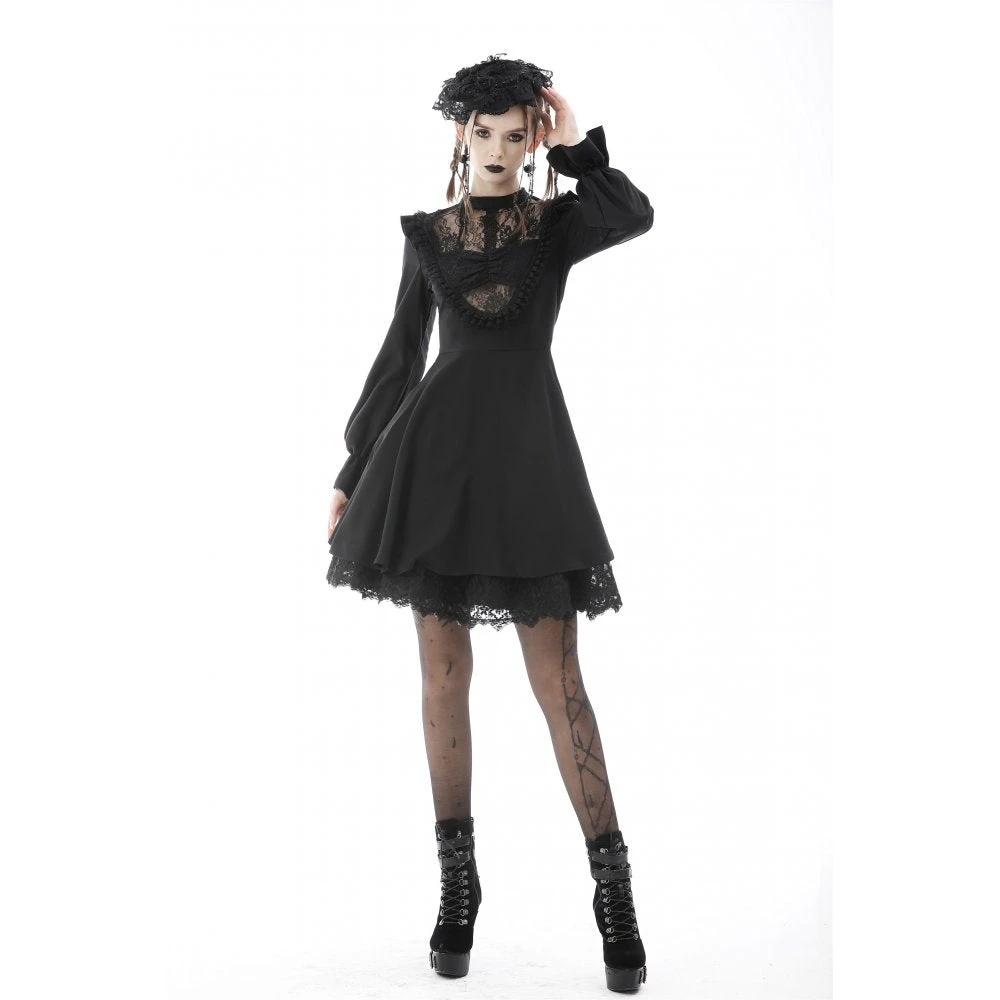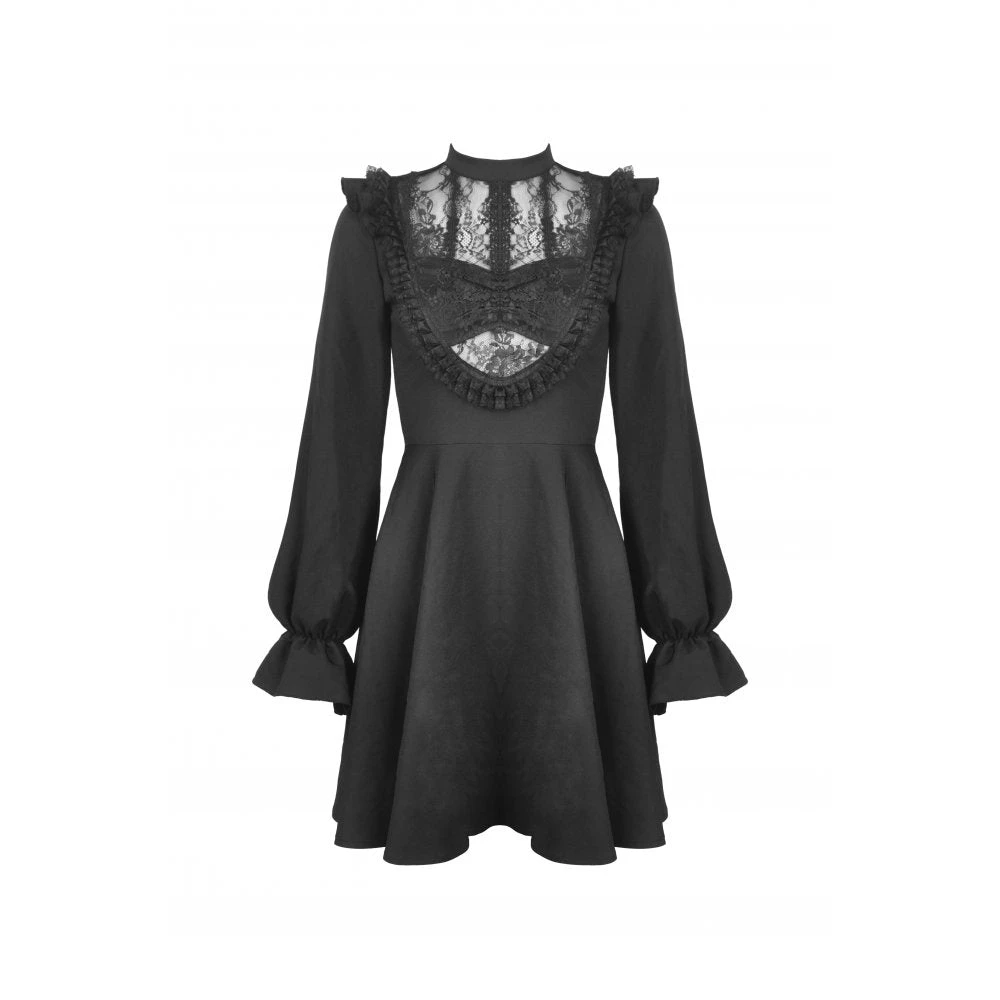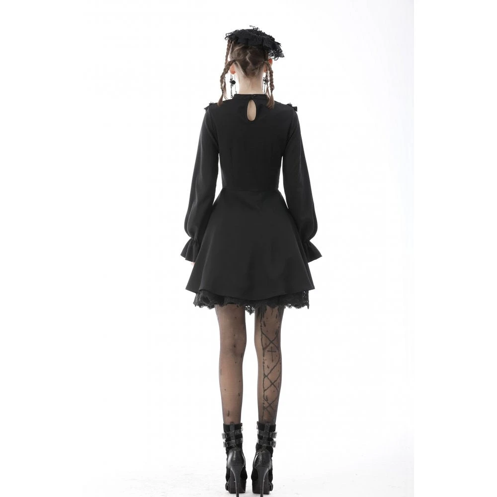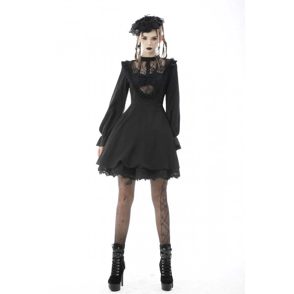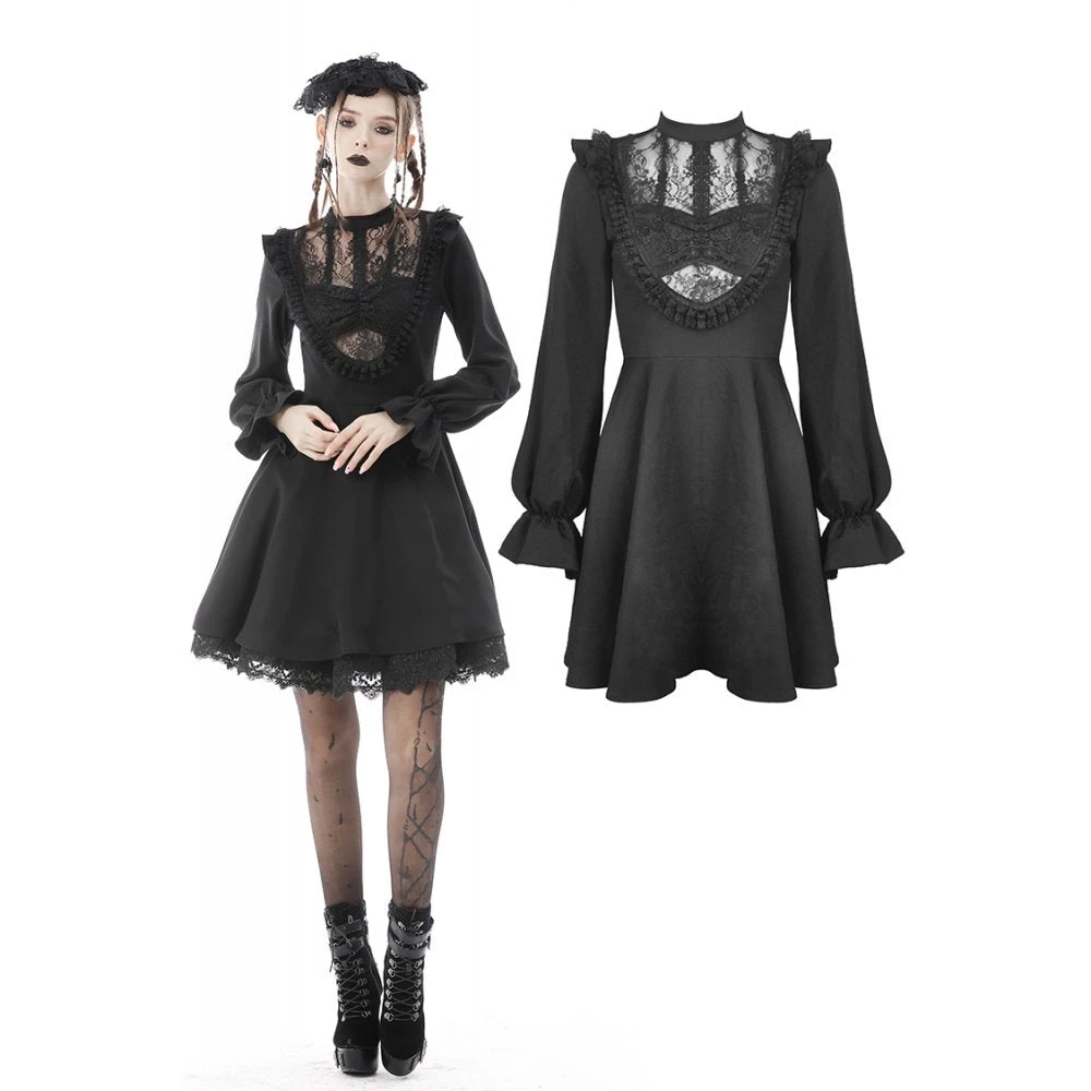 Beautiful and seductive black mini dress by Dark in Love in a soft slightly stretchy fabric with delicate lace detailing. This sexy mini dress features a super low neckline with built in bra and flirty lace paneling. Also featuring long sleeves, nipped in waist and flowing skirt, this dress stands out from the crowd.