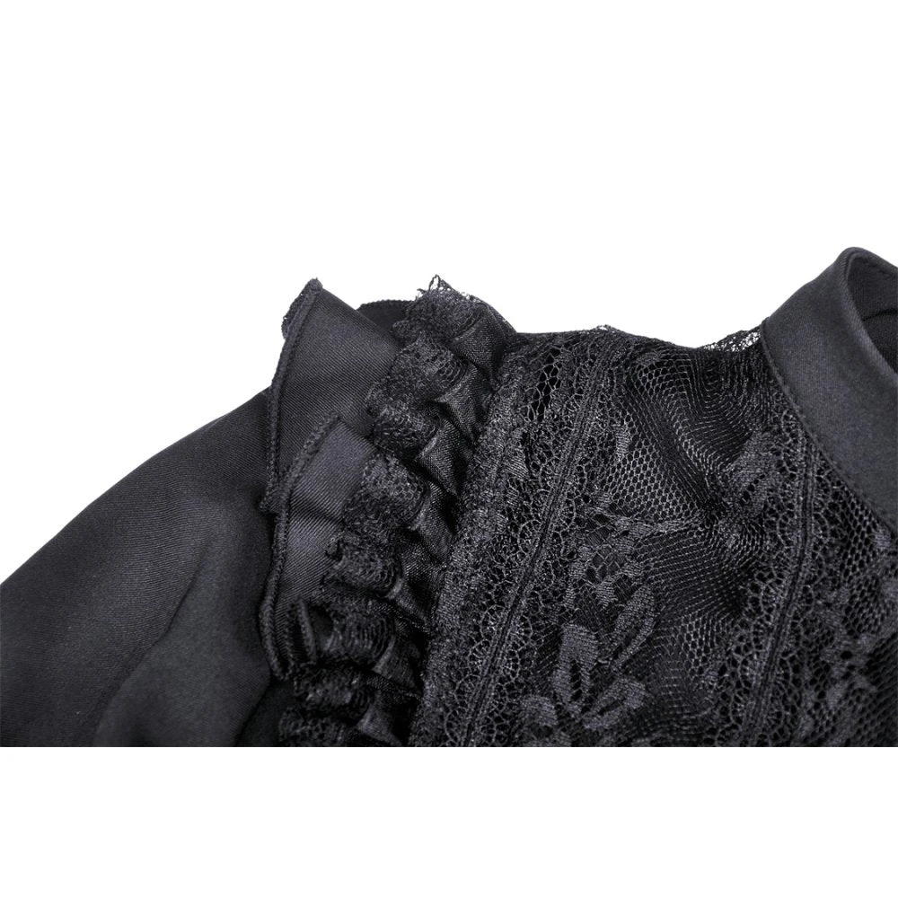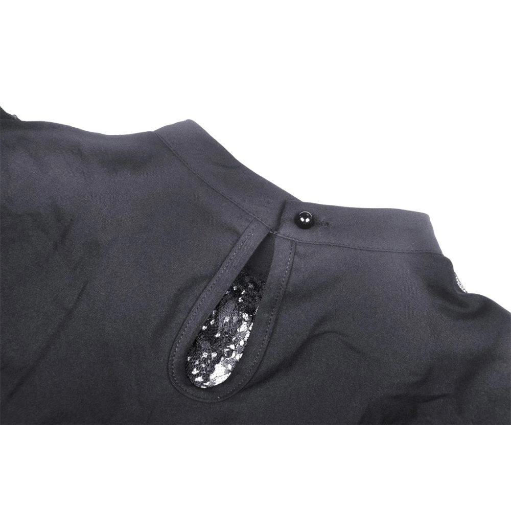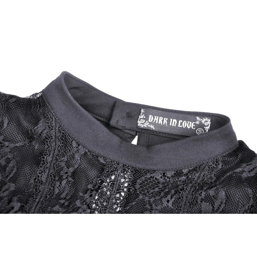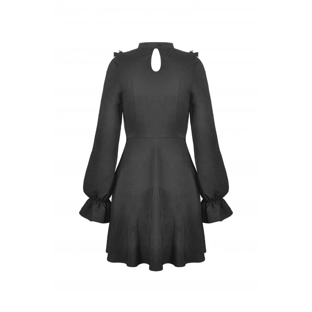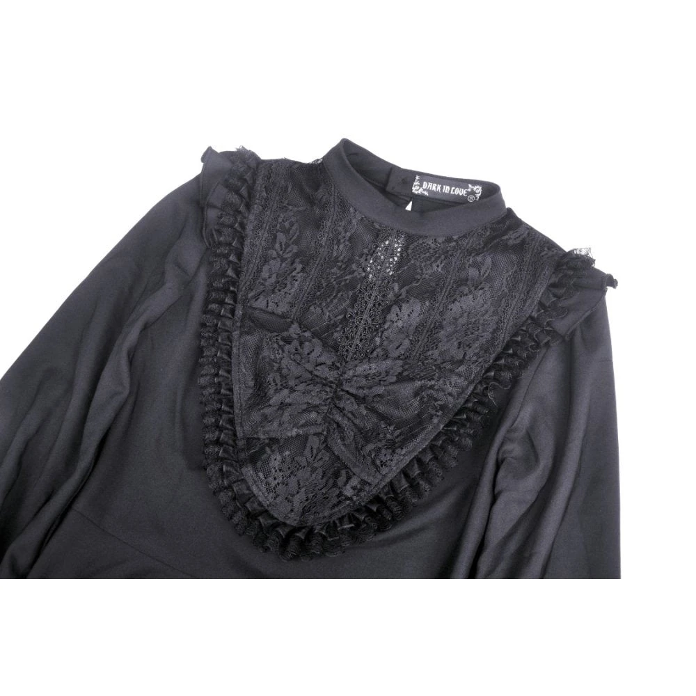 Beautiful and seductive black mini dress by Dark in Love in a soft slightly stretchy fabric with delicate lace detailing. This sexy mini dress features a super low neckline with built in bra and flirty lace paneling. Also featuring long sleeves, nipped in waist and flowing skirt, this dress stands out from the crowd.