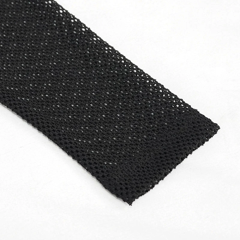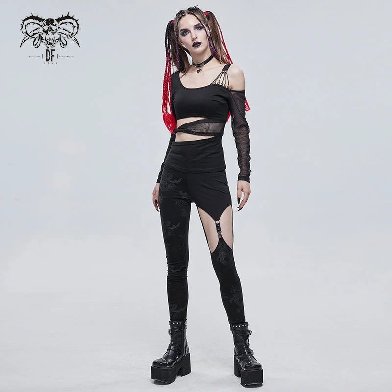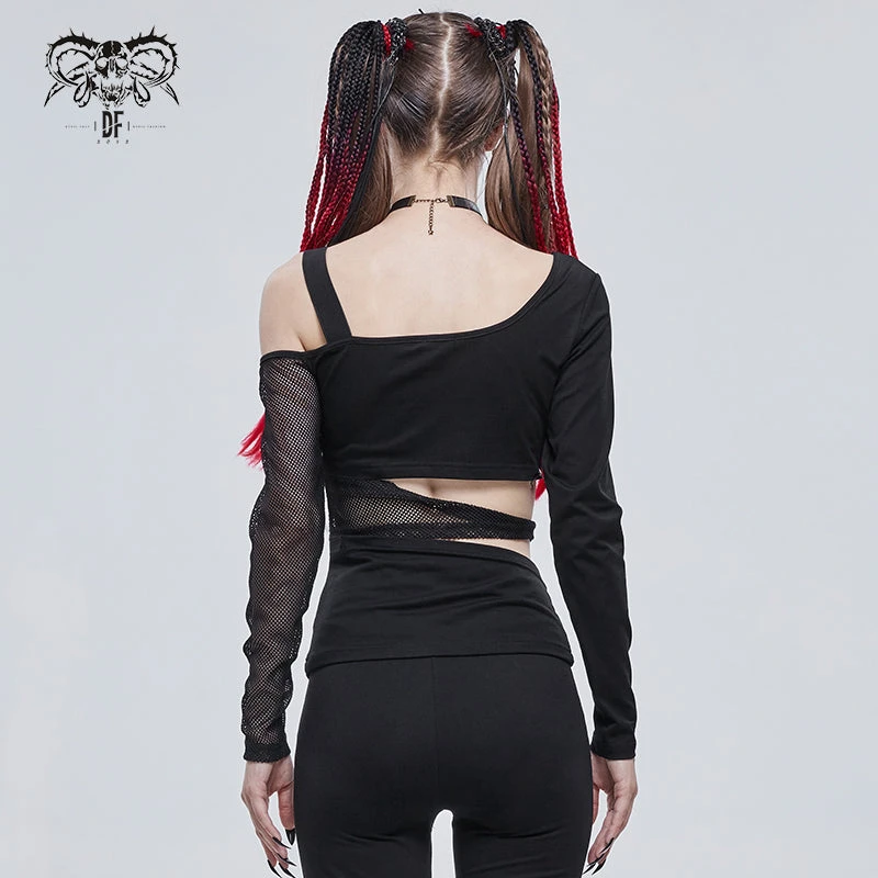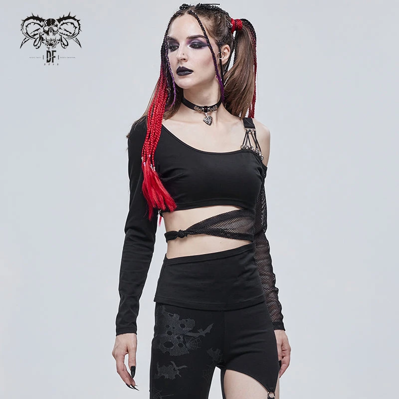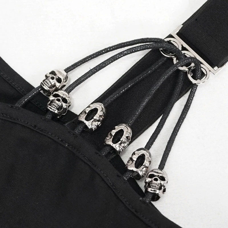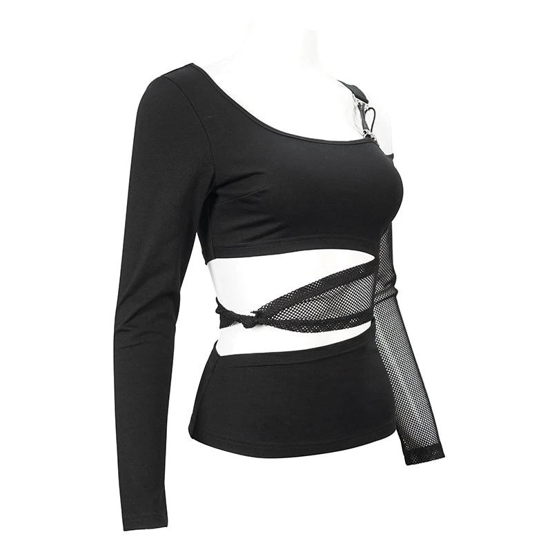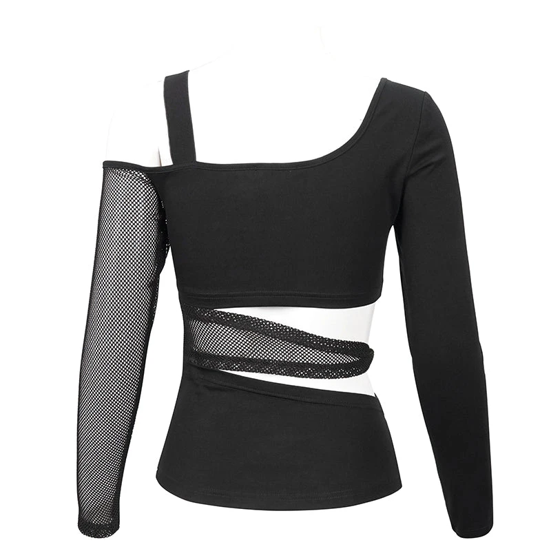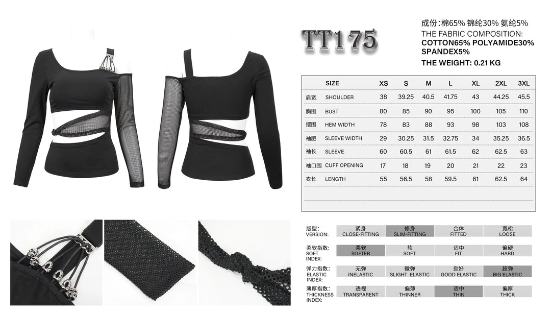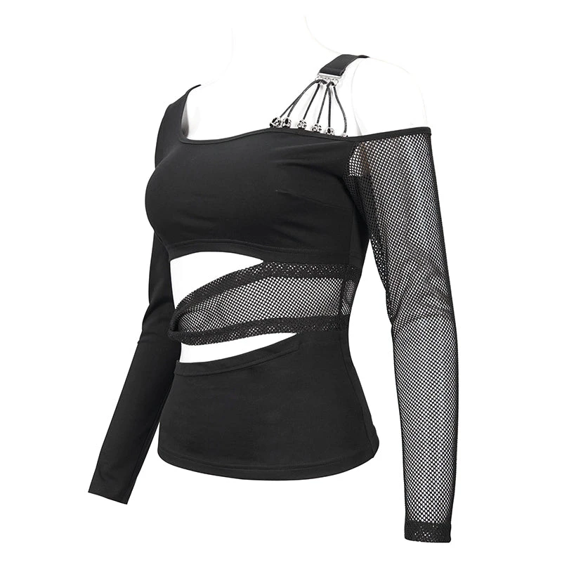 Edgy and sexy black top from Devil Fashion with asymmetric styling and mesh panels. This must-have top is made from a stretchy lightweight cotton blend fabric that is fitted to show off your curves. This gorgeous black top features cut outs and metal skull beads and string detailing for a stand out look that will bring a gothic edge to any look!