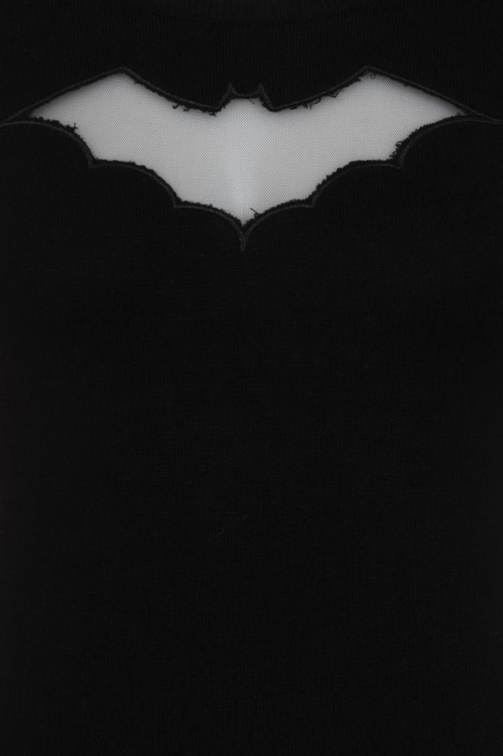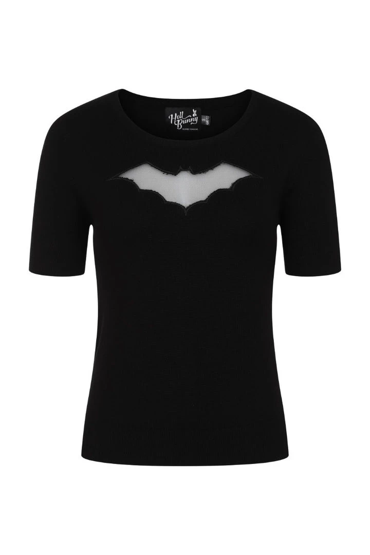 This super cute knit top from Hell Bunny features short sleeves and a round neckline. A mesh backed bat shaped cut-out design completes this wardrobe must-have.
