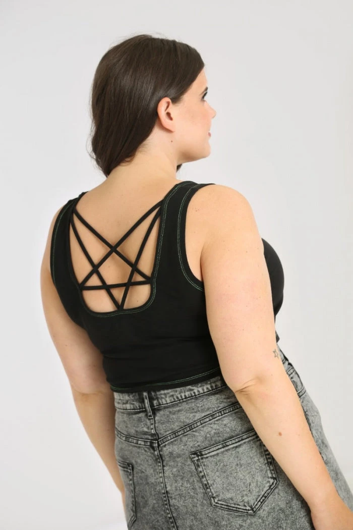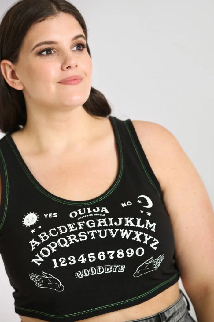 Amazing must-have black loungewear crop top from Hell Bunny. The Ouija crop top features a white contrast ouija symbols and contrasting neon green stitching! Perfect for lounging, this fitted top is made from a super soft and cosy cotton jersey and also features a low back with pentagram crisscross strap detailing. Match perfectly with the Ouija Joggers!
