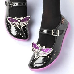 Chocolaticas® Death Moth Women’s Mary Jane Flat Shoes. These gorgeous black patent fabric shoes are proudly vegan with a lovely purple and white contrast moth design. Featuring a non-marking purple rubber sole, you also get the comfort of a cushioned inner sole. You’ll fall in love with these stunning shoes which feature an adjustable buckle and printed fabric upper.