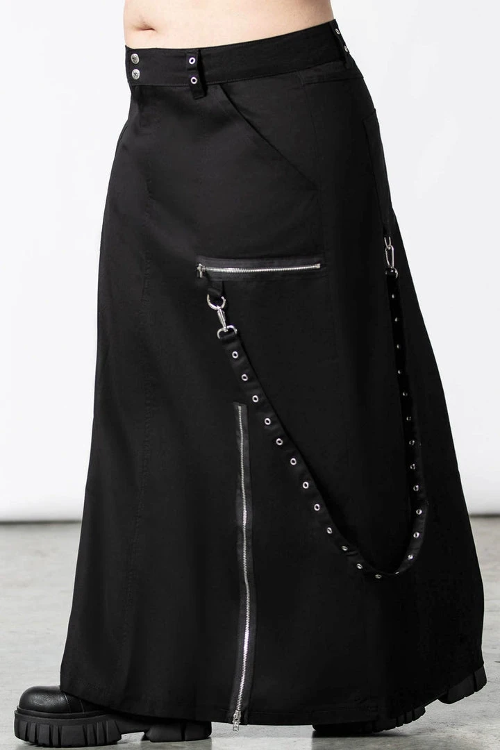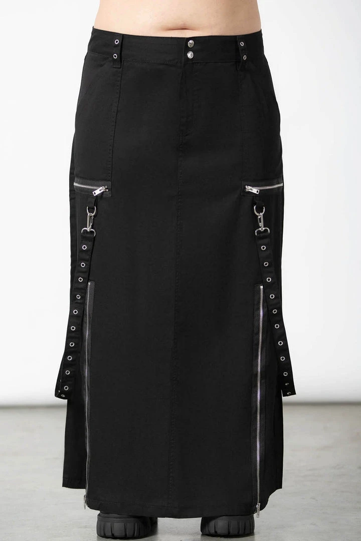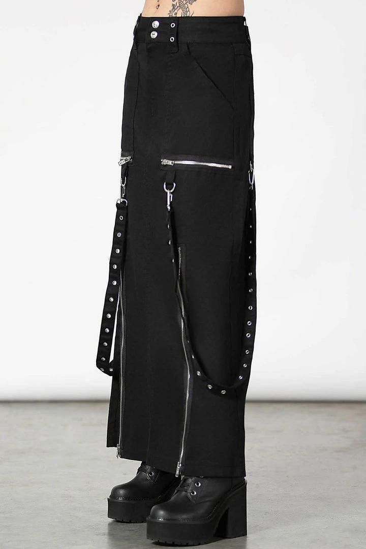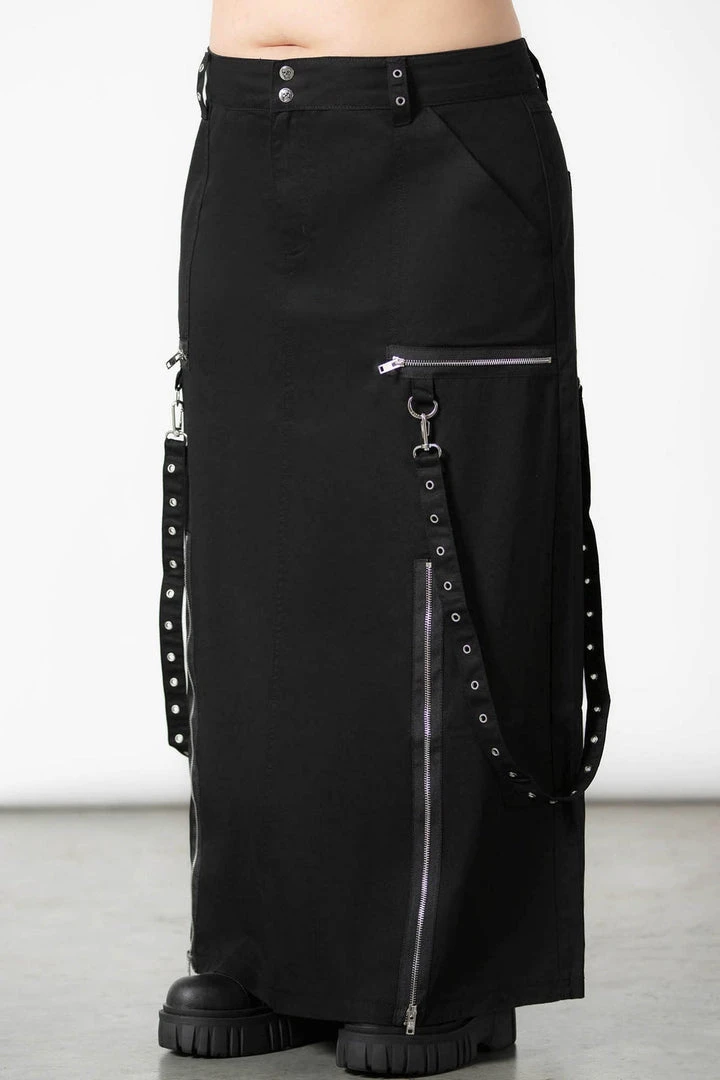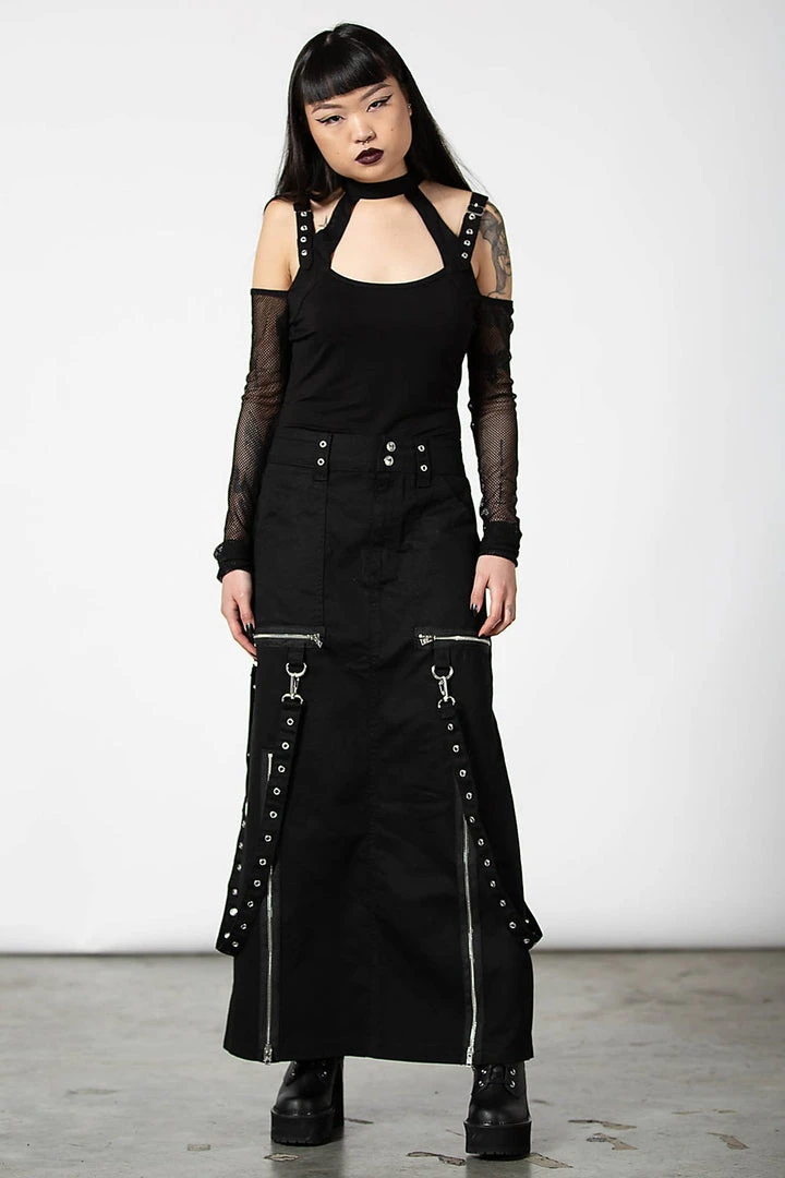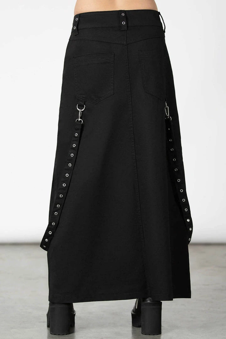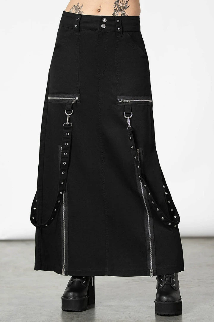 This stylish black maxi skirt by Killstar is made from soft cotton twill fabric that is fitted to show off your curves. This gorgeous black maxi skirt also features zip details, pockets, detachable straps and double button closure for an versatile yet edgy look!