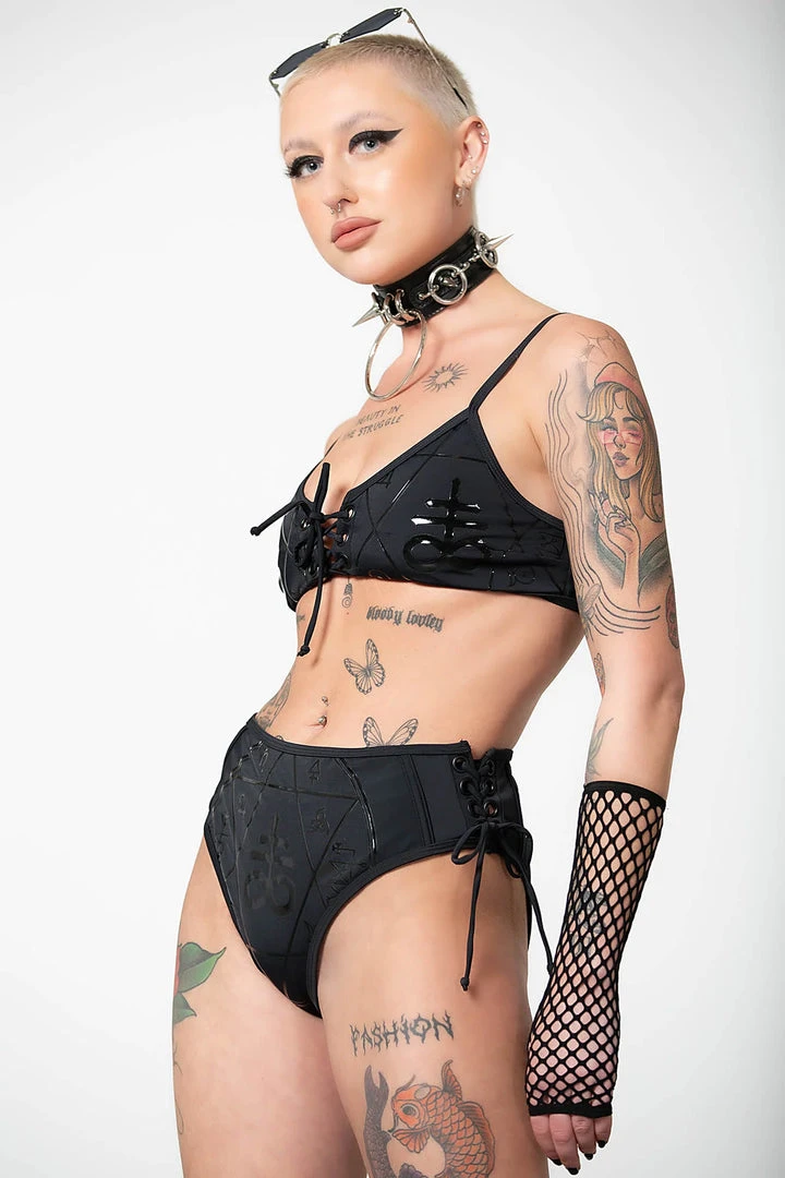 Gorgeous two piece black swimsuit from Killstar that is as hot as hell! This stunning black bikini is a gothic dream with a statement lace up corset design with black on black print! This head turning swimwear is made from a soft nylon blend fabric with non padded cups, adjustable straps and side tie bottoms!
