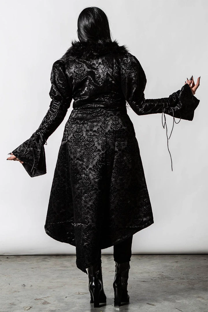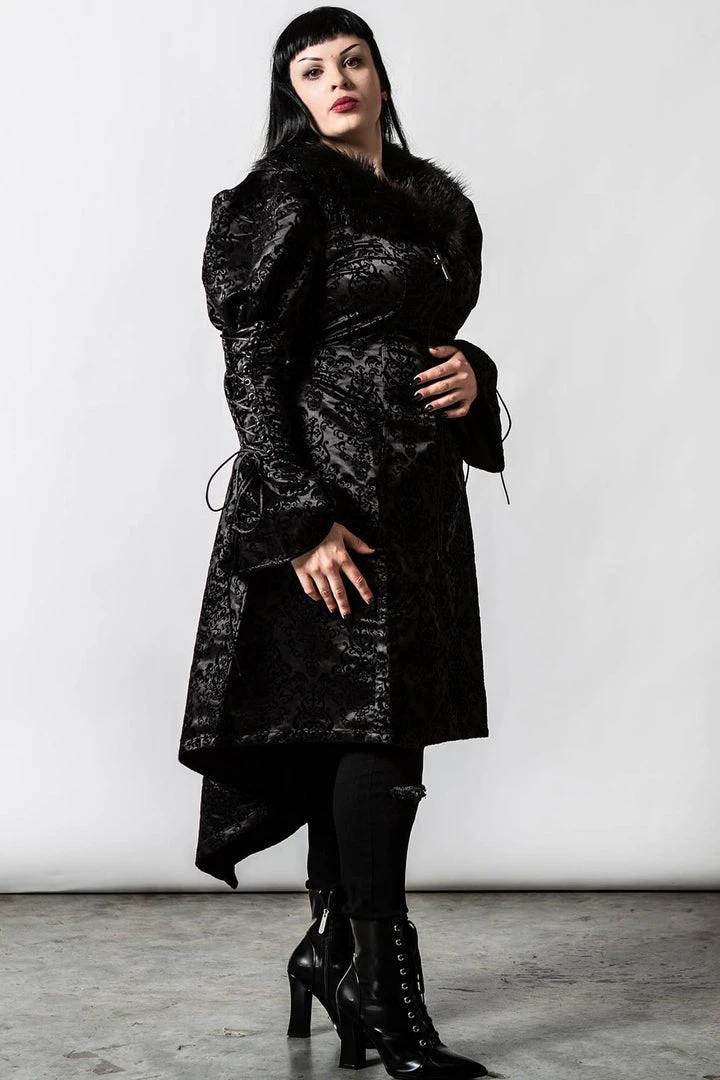 Glamorous and stylish knee length black velvet brocade coat from Killstar. This must-have stunning mid-length coat with longer length back is made with embossed velvet with statement sleeves that will flatter your figure to perfection while keeping you warm and cosy. This elegant coat is a gothic dream and features pockets, faux fur accents and zip front with metal cross pull. A must-have for your cold weather wardrobe!
