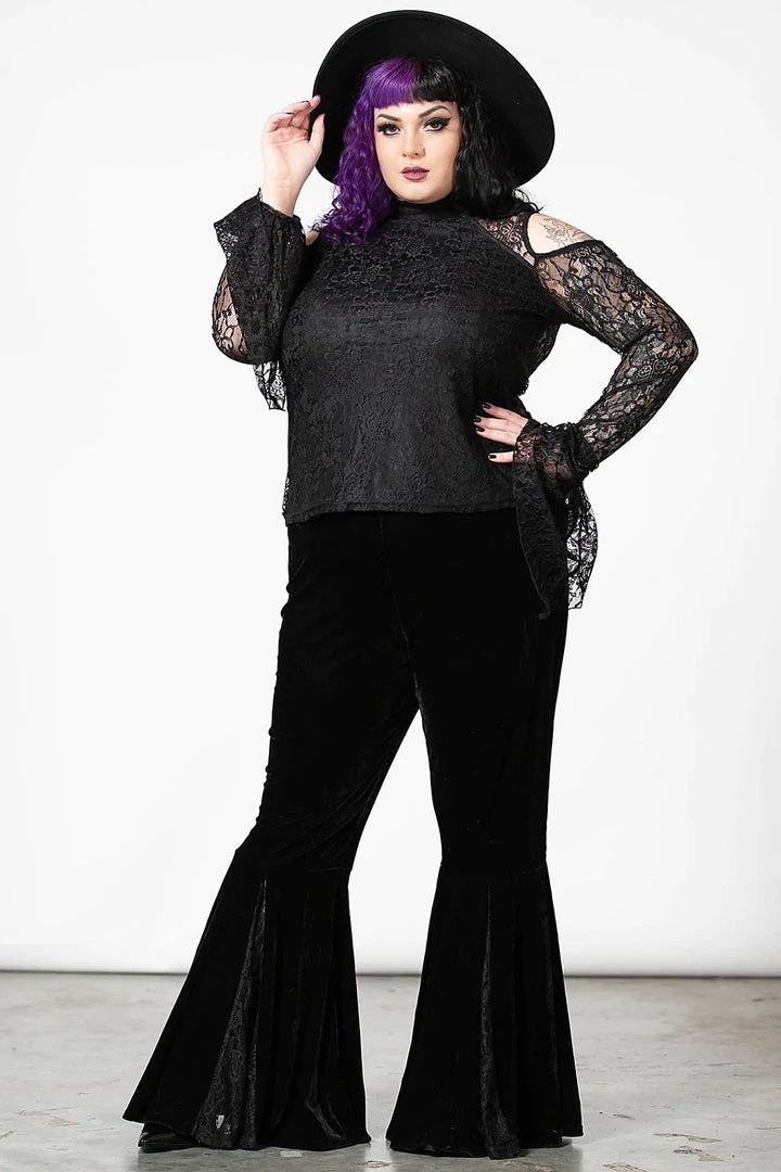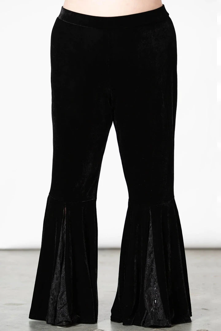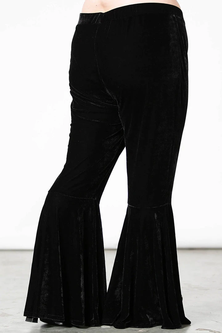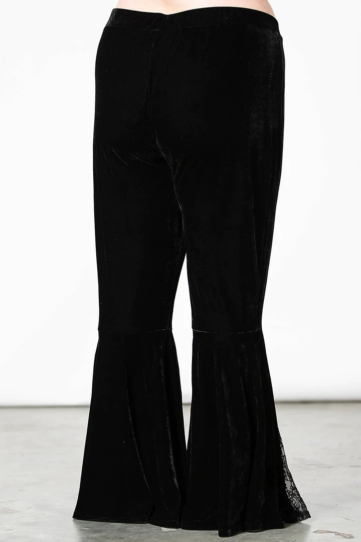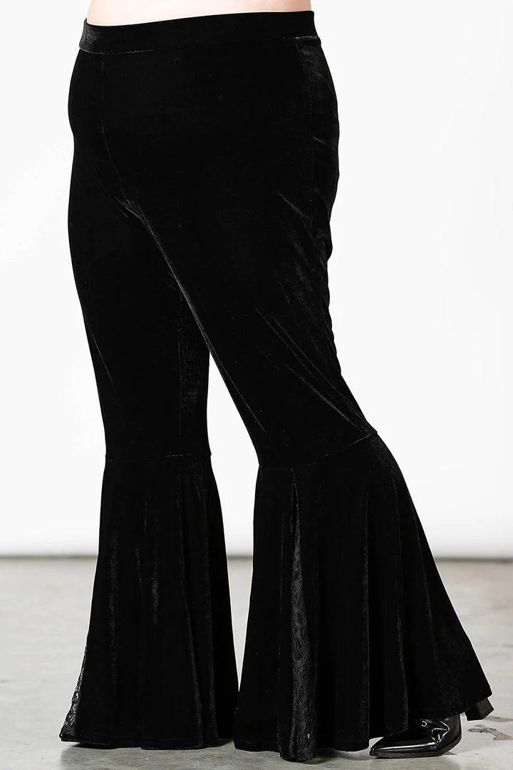 These gorgeous black flares from Killstar are made from a luxuriously soft stretchy velvet fabric that will give you the ultimate comfort and fitted style. These must-have black velvet bell bottoms feature a fitted waistband, and flared lace inserts! Dress them up or down!