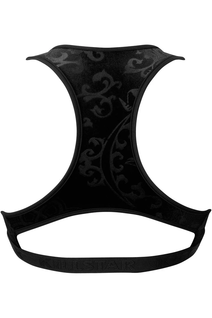 Amazing black bralet by Killstar that is made from a luxurious stretchy burnout velvet fabric that will show off those curves. This gorgeous cropped bra top features a low neckline with racer back with cut out. Looks stunning as leisure wear or dressed up as you please!