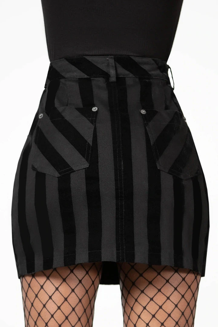 Must-have gothic mini skirt from Killstar! This awesome black mini skirt is super versatile and features a full-length front zip fastening with top buttons, belt loops and back pockets. Made from a soft black stripe flocked denim fabric and easy to dress up or down according to your mood!