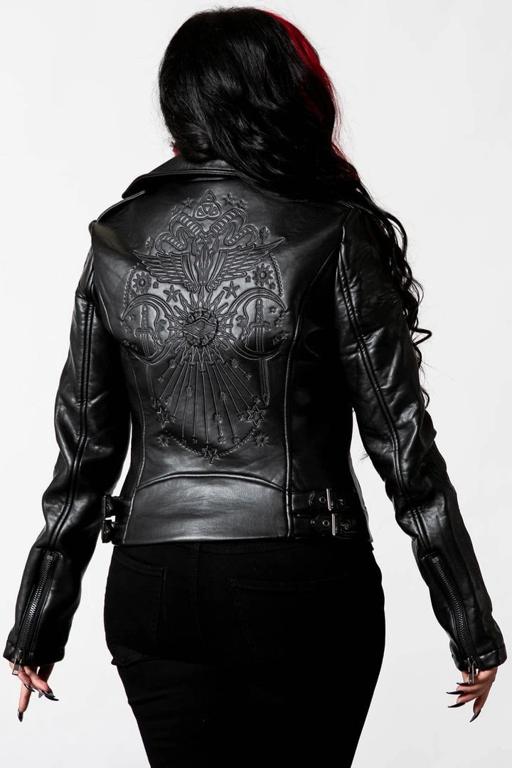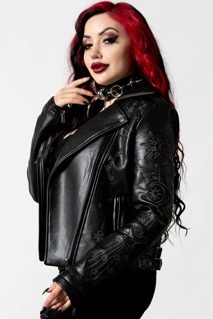 Killstar Starchild Biker Jacket: This classic fitted black biker jacket from Killstar is made from vegan leather with a flattering fitted design and intricate embroidery detailing! This gorgeous black faux leather jacket features a zip front, zip and stud pockets and satin lining!