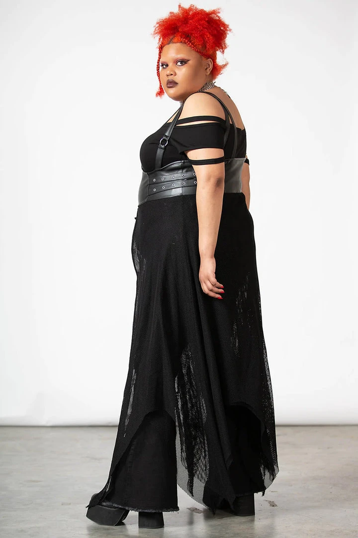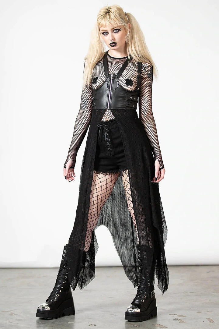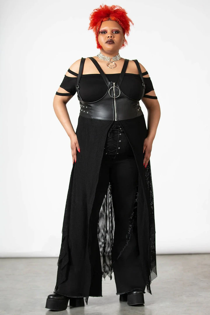 Stunning sexy gothic black underbust duster from Killstar made from a stretch vegan leather fabric with long mesh skirt. The seductive body hugging black bodice will show off your curves to perfection with some extra attitude and also features a full front zip and large metal O ring hardware.