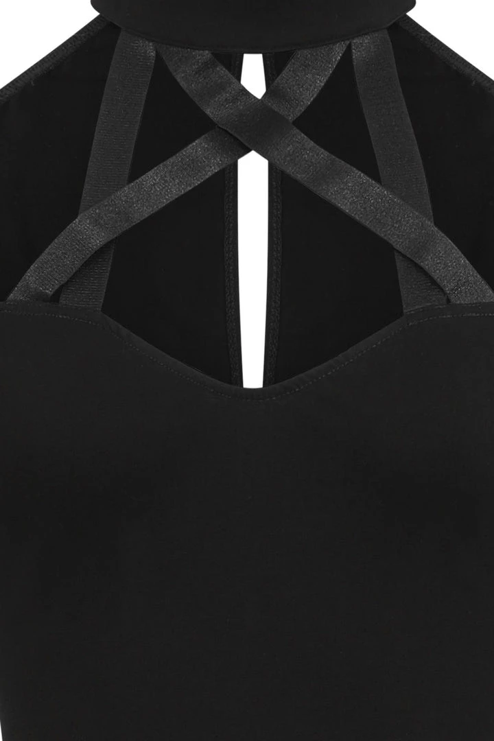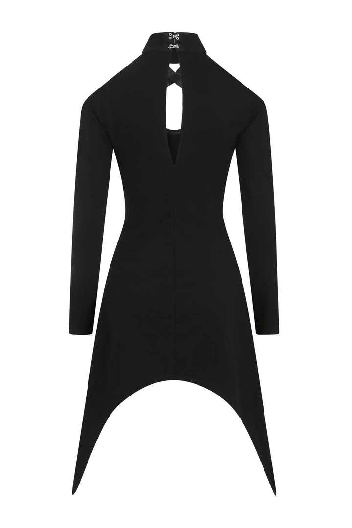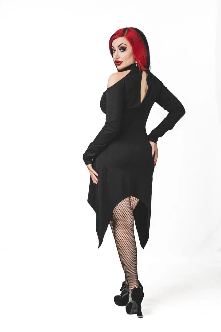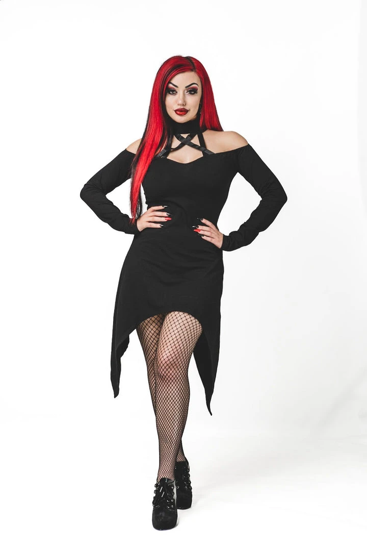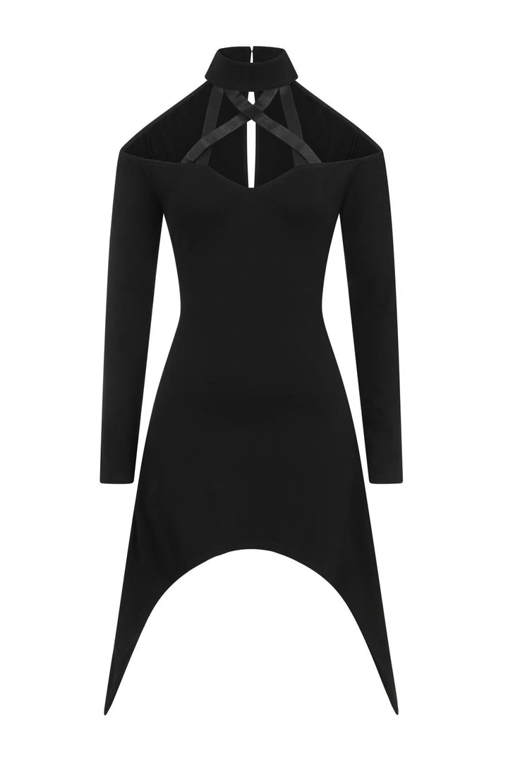 Stunning long sleeved dress from Necessary Evil featuring a high neckline with a cut-out décolletage and strap detail. With hook & eye fastening to the back of the neck, this flattering dress has an irregular hemline and the perfect amount of stretch.