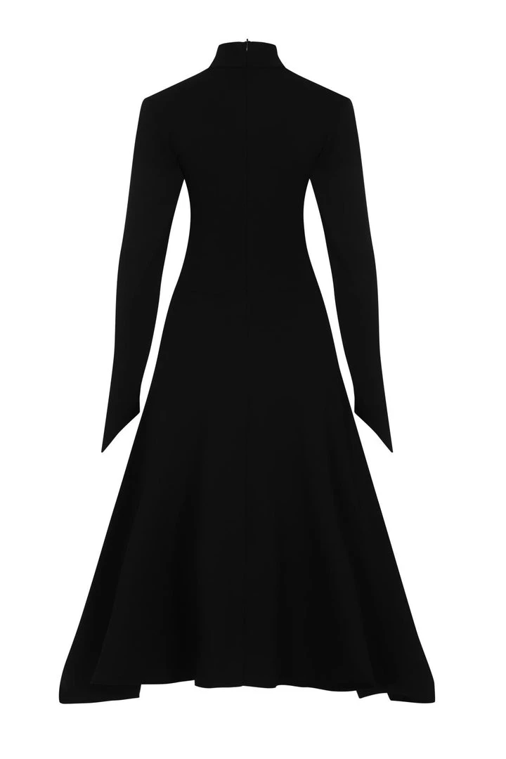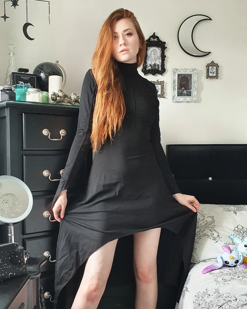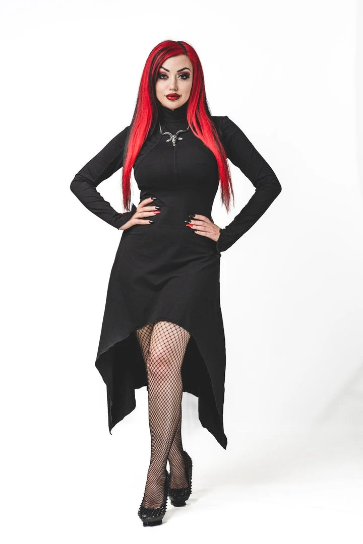 Necessary Evil Minerva High Low Black Dress is designed with a long fit in the back and short front. This stunning black gothic dress features a high stretch stitched collar and ribs stitched into the bodice and sleeve panels for a sleek structured fit!