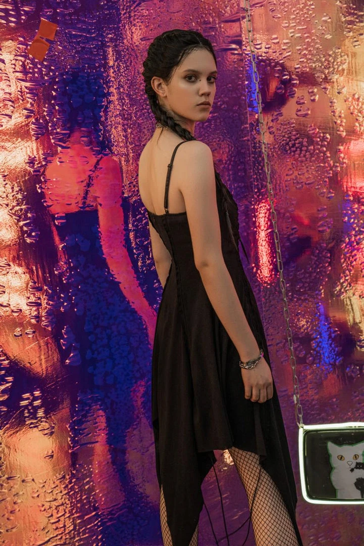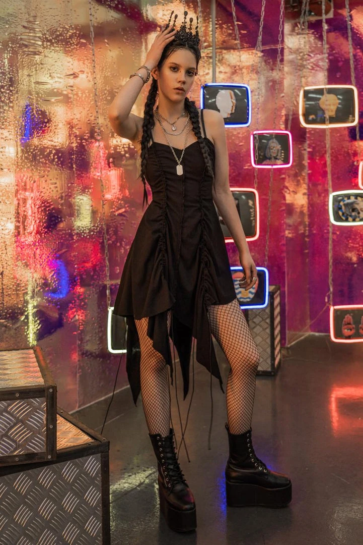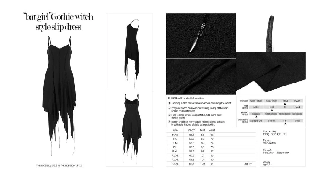 Beautiful little black dress from Punk Rave! Featuring adjustable faux leather spaghetti straps and a witchy hemline. This stunning dress has a flattering fit and the exposed seam detail with drawstrings to style as you want gives it that finishing touch. Fastening with a concealed zip to the back, for the perfect fit please see Punk Rave’s size guide in the images.
