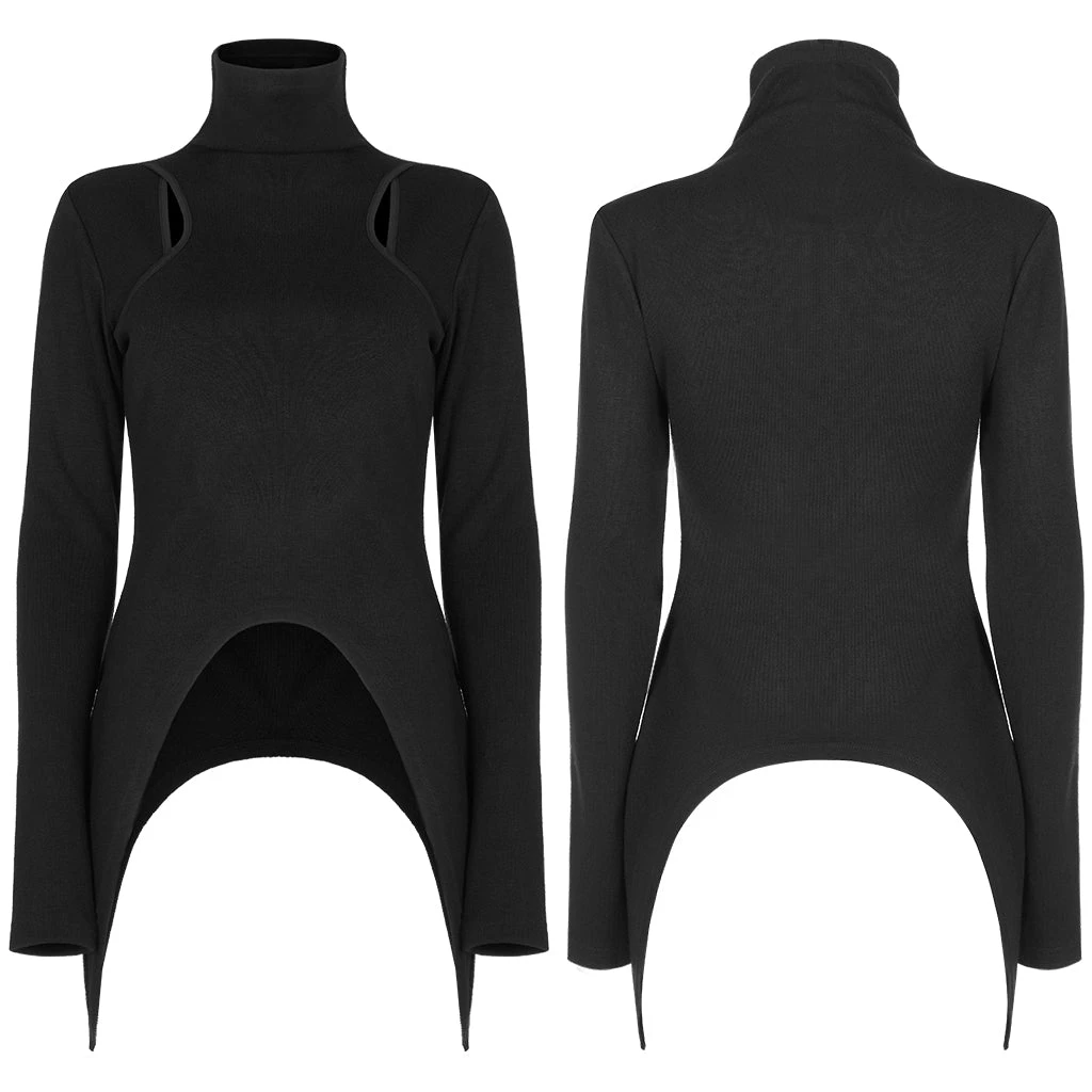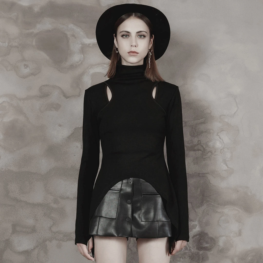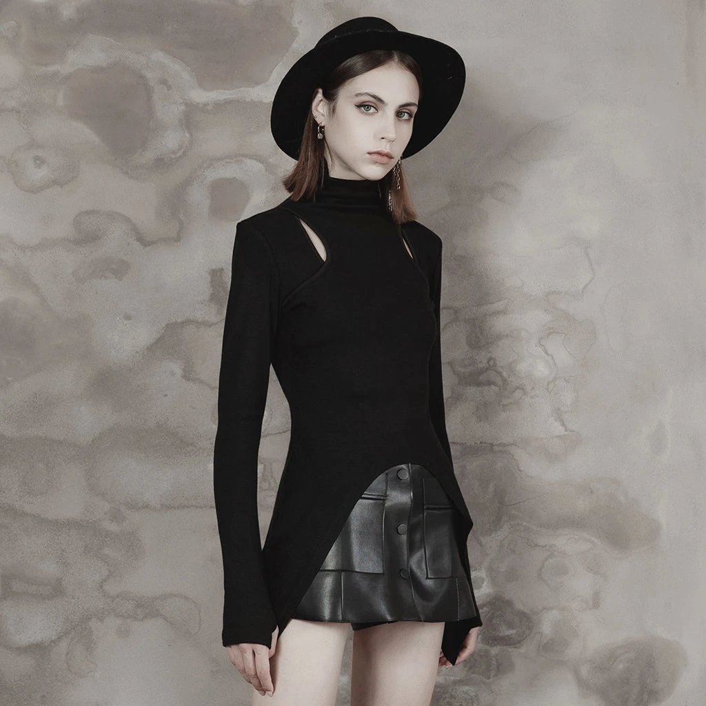 Stunning high collar black shirt with long sleeves, thumbholes and pointed hems from Punk Rave. Destined to be your next wardrobe staple, this versatile and stylish top is stretchy and fitted and also features playful chest cutouts and sharp hemlines as an added style detail. Looks amazing dressed up or down!