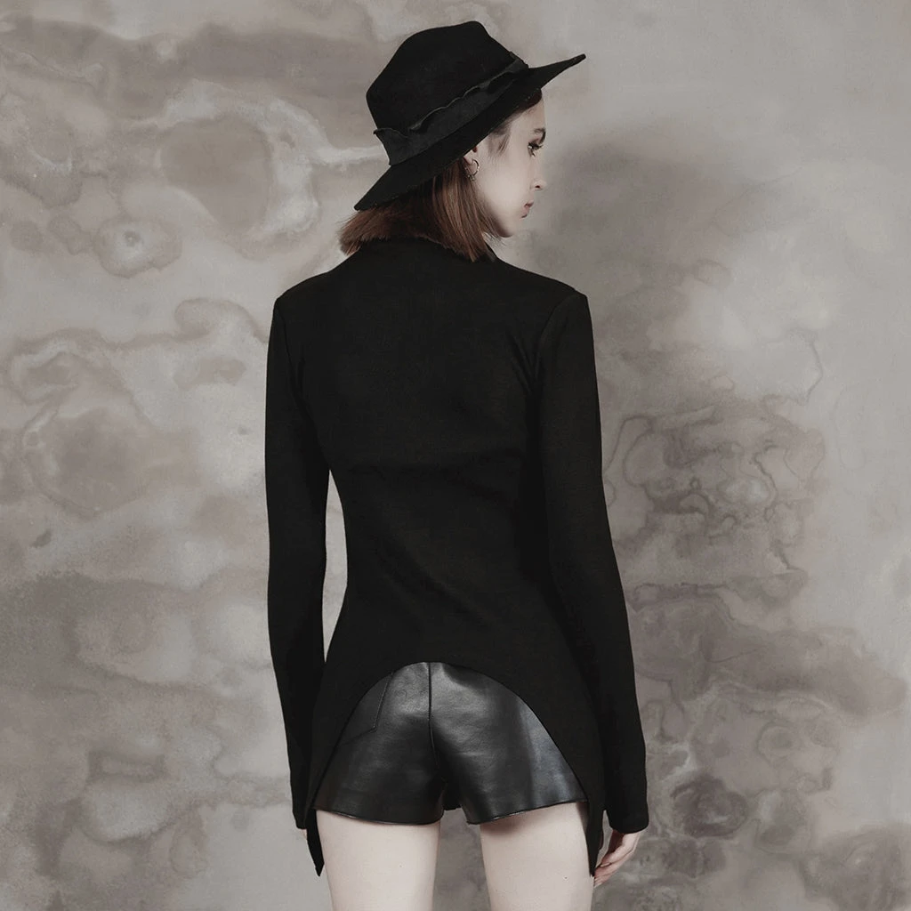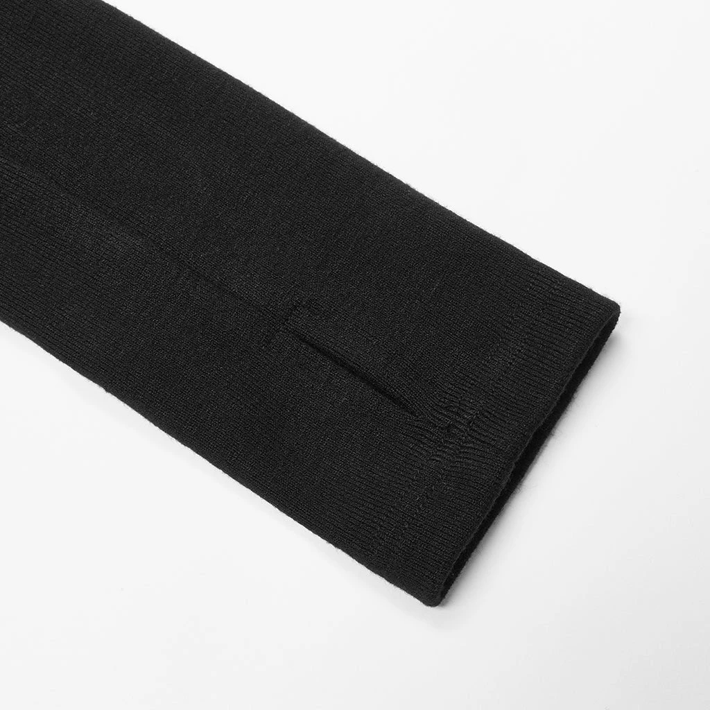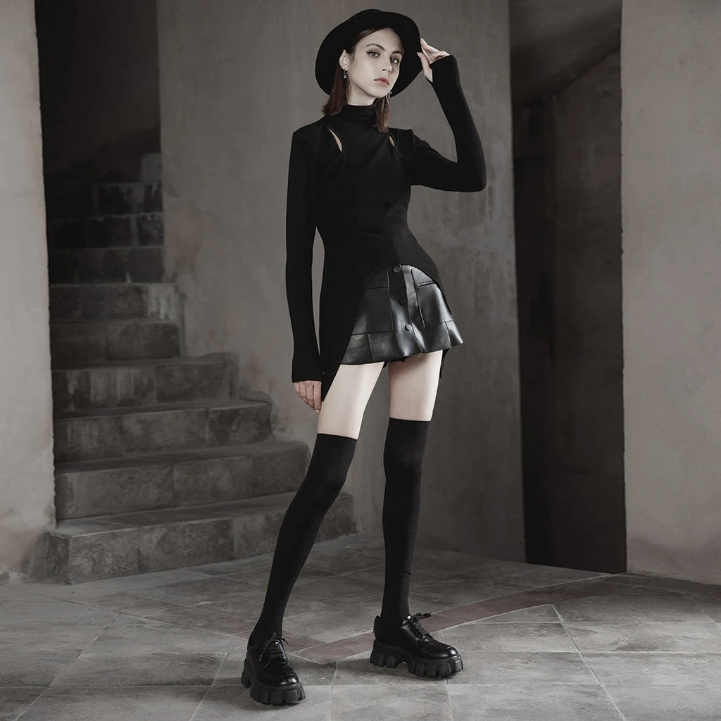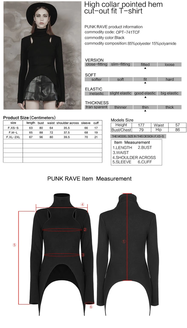 Stunning high collar black shirt with long sleeves, thumbholes and pointed hems from Punk Rave. Destined to be your next wardrobe staple, this versatile and stylish top is stretchy and fitted and also features playful chest cutouts and sharp hemlines as an added style detail. Looks amazing dressed up or down!