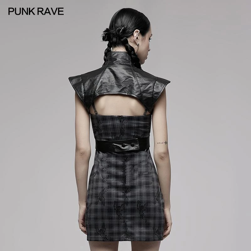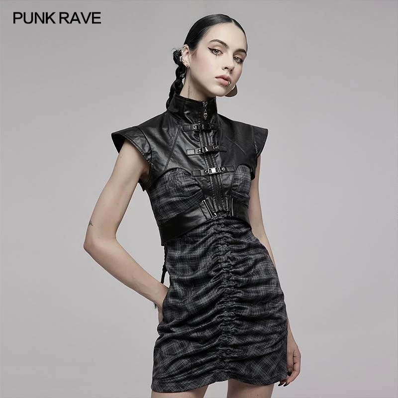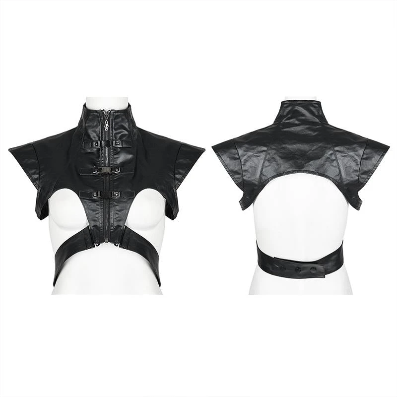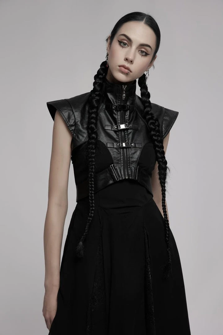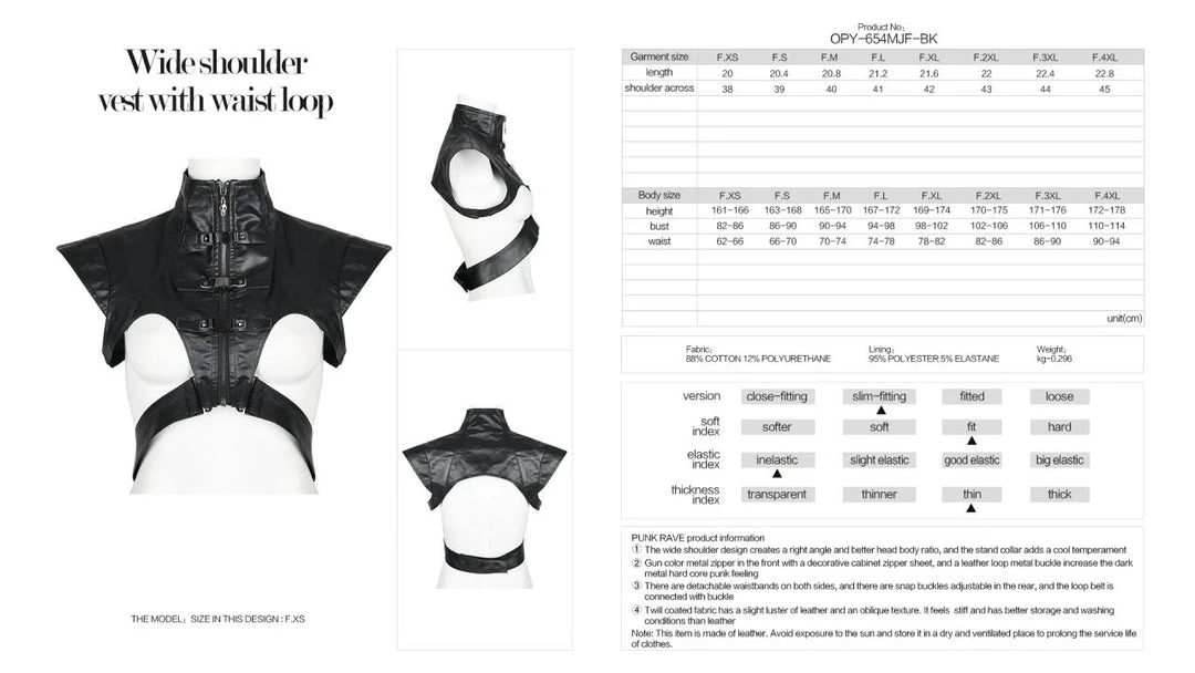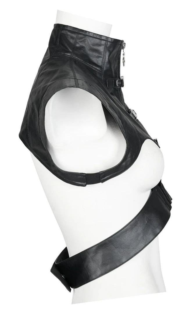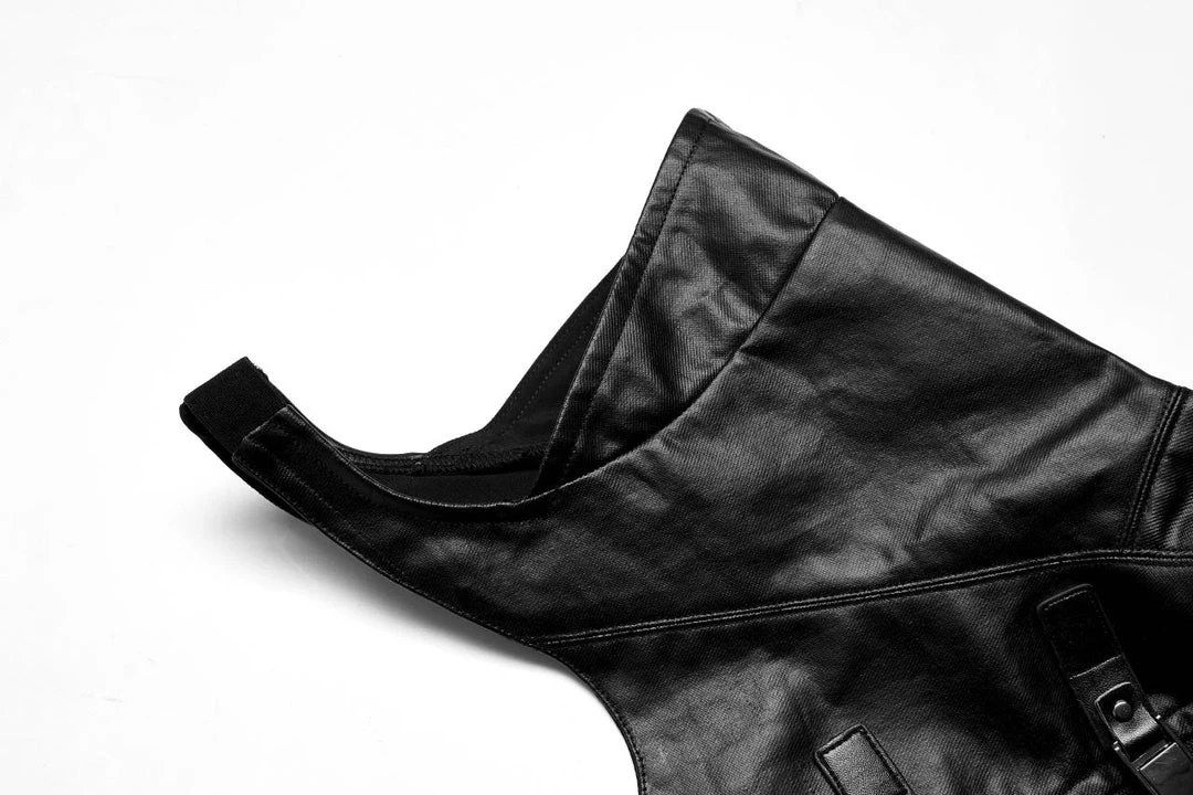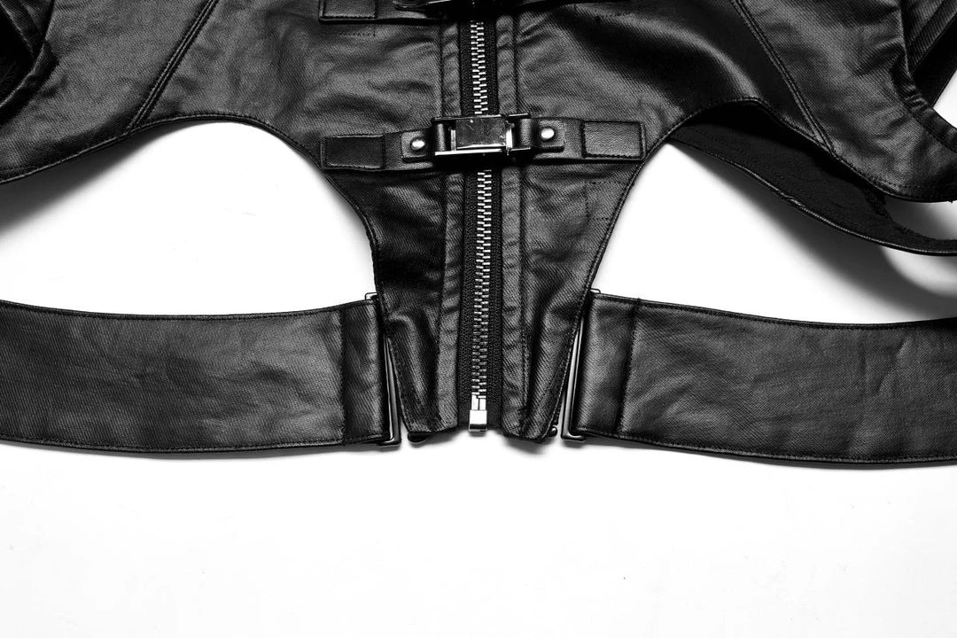 Striking leather look vest from Punk Rave featuring a high neckline and extra wide shoulders. Fastening with a bold zip to the front, this awesome top has a detachable waist strap, buckle details and a skull zip pull. For the perfect fit and fabric composition, please see Punk Rave’s size guide in the images.