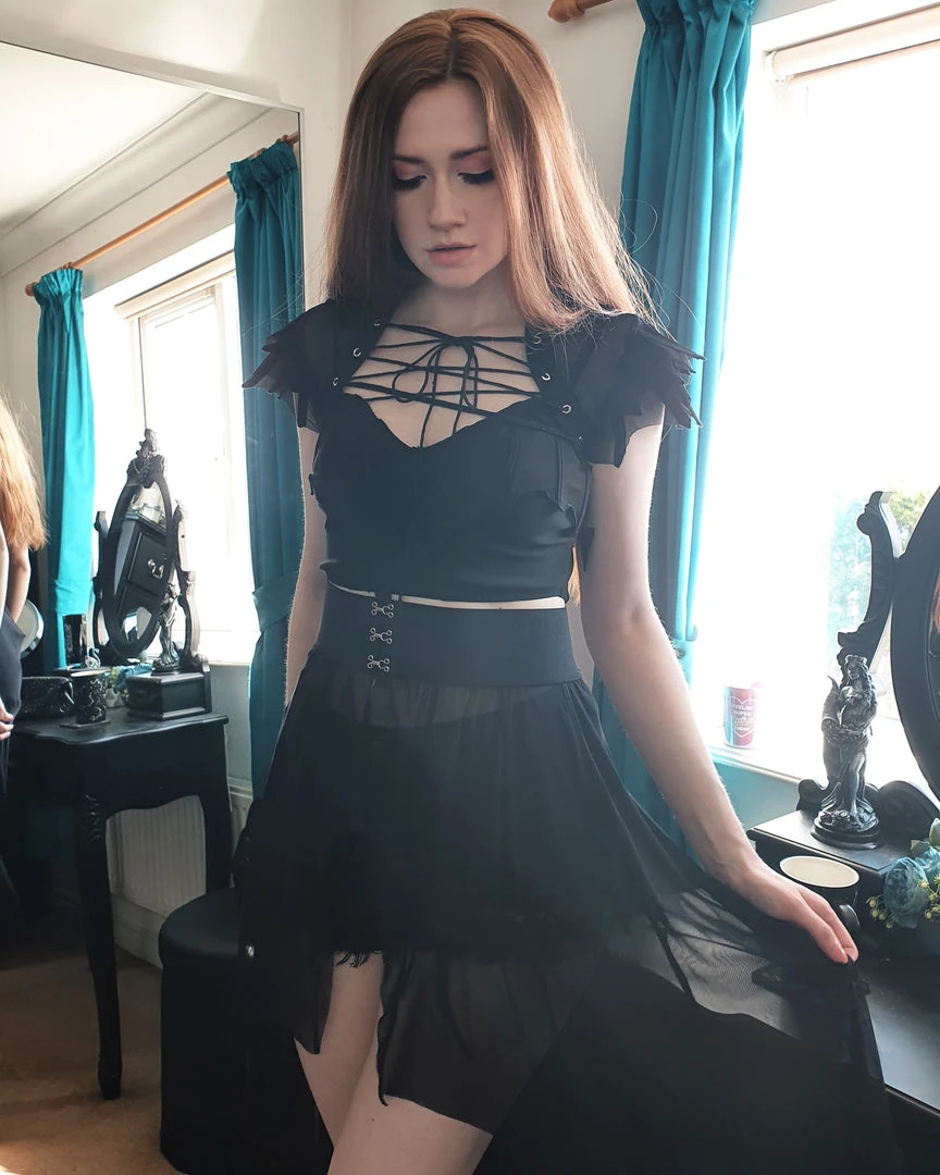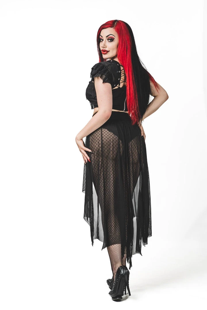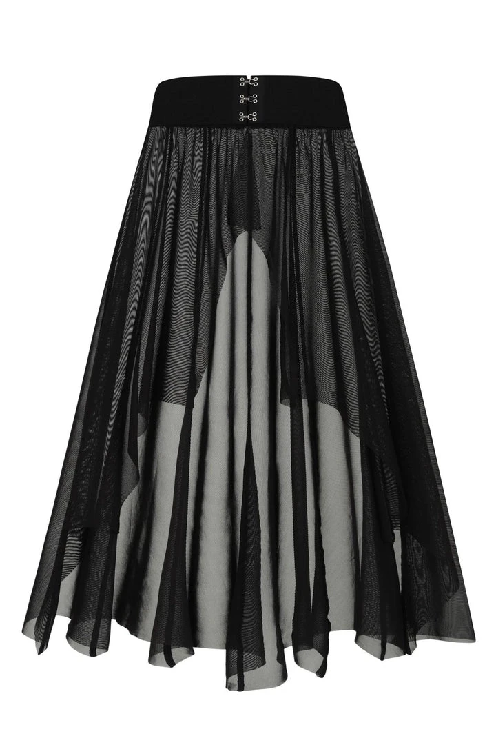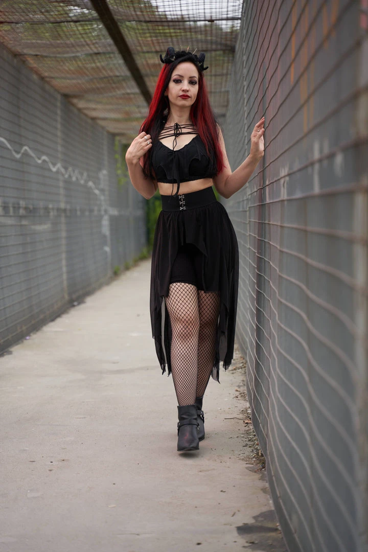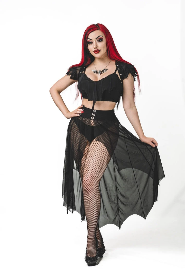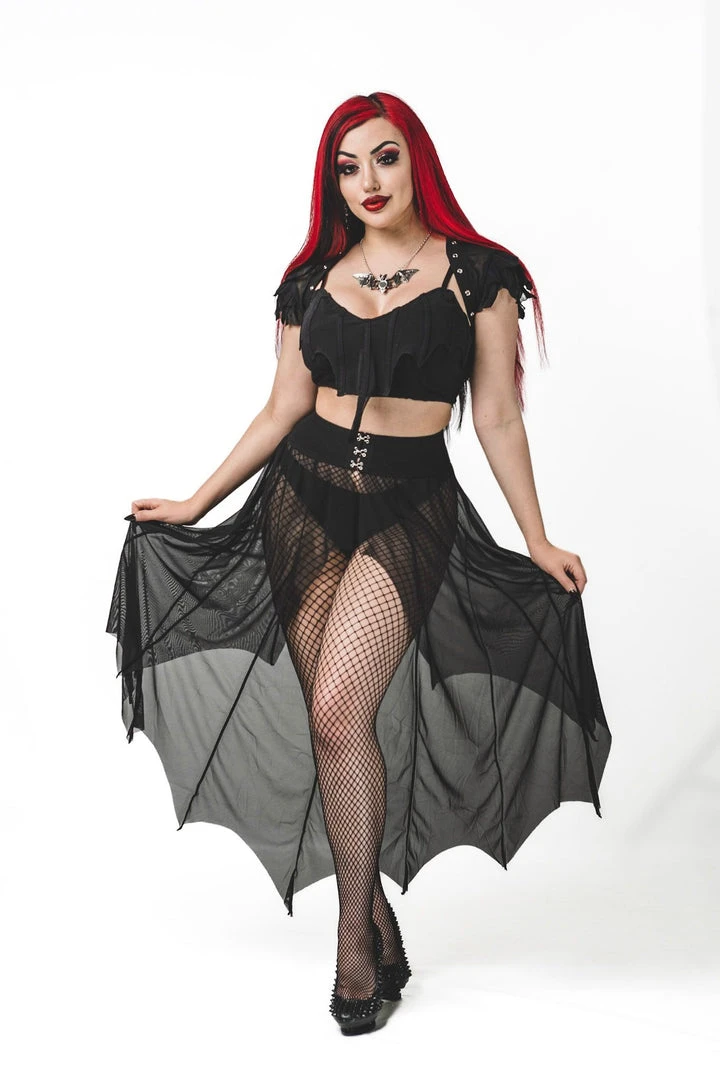 Necessary Evil Camazotz Black Mesh Bat Wing Effect Train Belt is a flowing mesh skirt which is long at the back and short at the front. Perfect for layering, this see through mesh train belt features long black mesh panels in a bat wing effect. This elegant piece is designed with a wide elastic waistband with hook and eye fastening. Looks great over shorts or leggings!