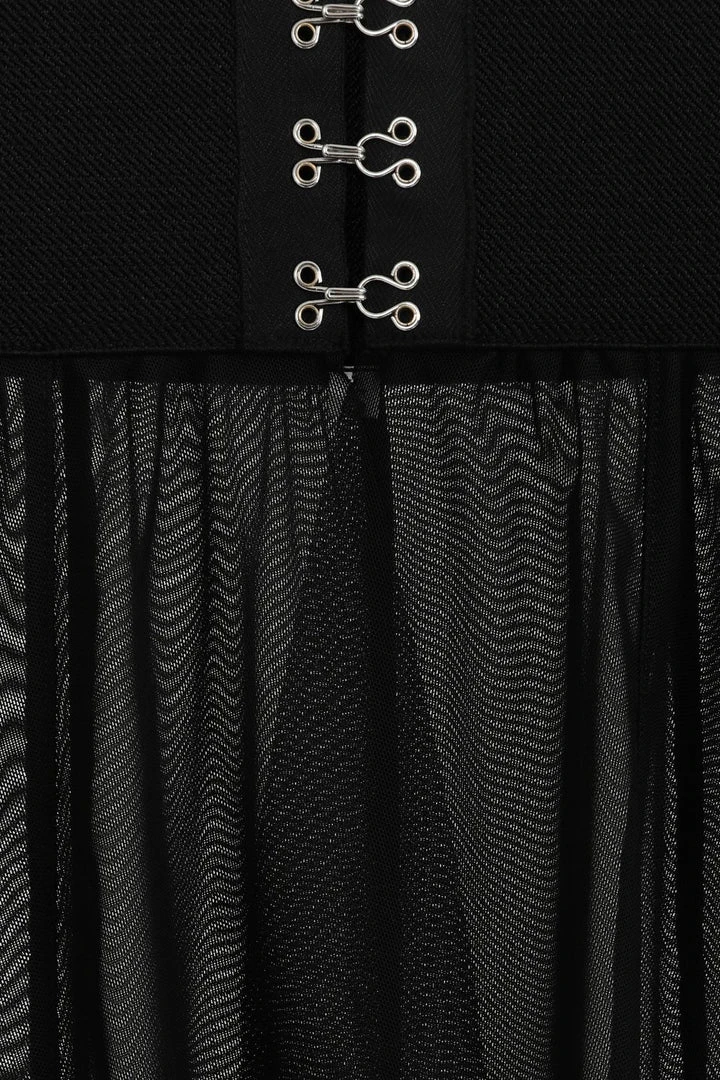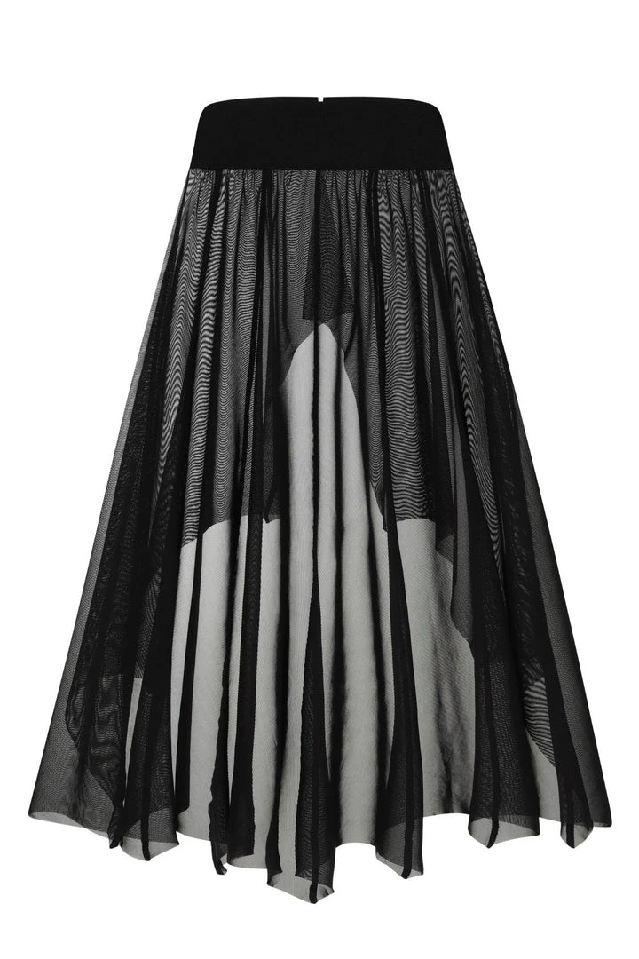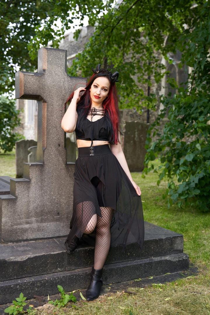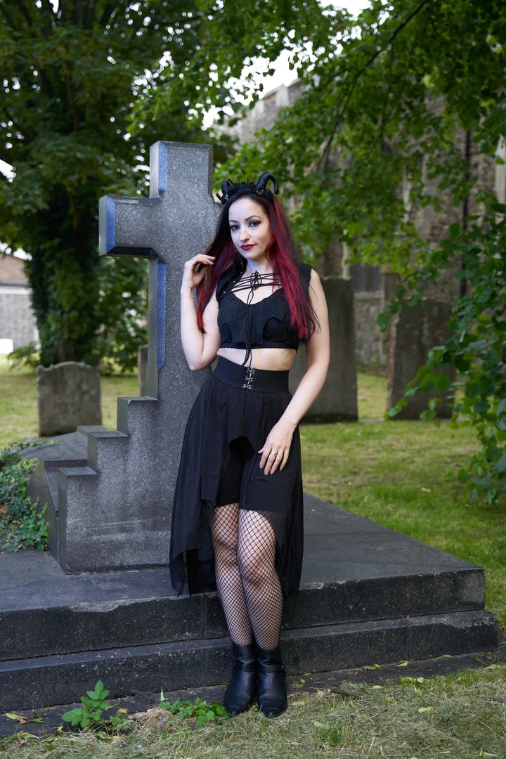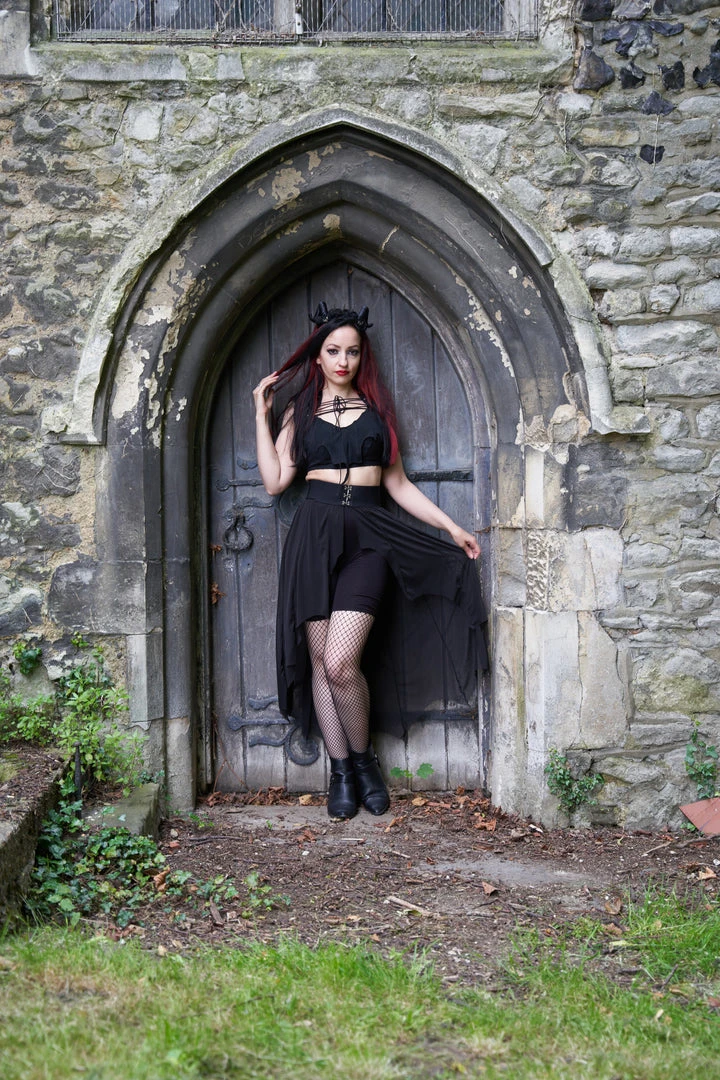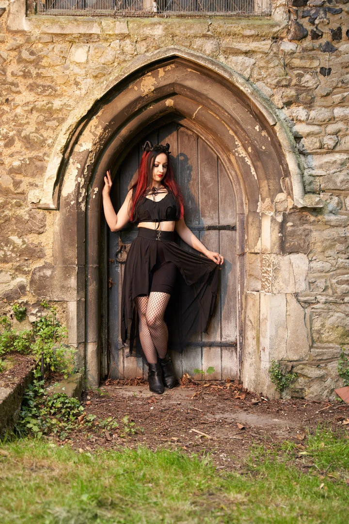 Necessary Evil Camazotz Black Mesh Bat Wing Effect Train Belt is a flowing mesh skirt which is long at the back and short at the front. Perfect for layering, this see through mesh train belt features long black mesh panels in a bat wing effect. This elegant piece is designed with a wide elastic waistband with hook and eye fastening. Looks great over shorts or leggings!