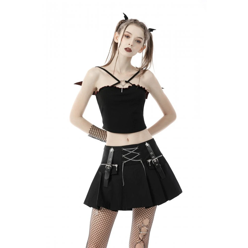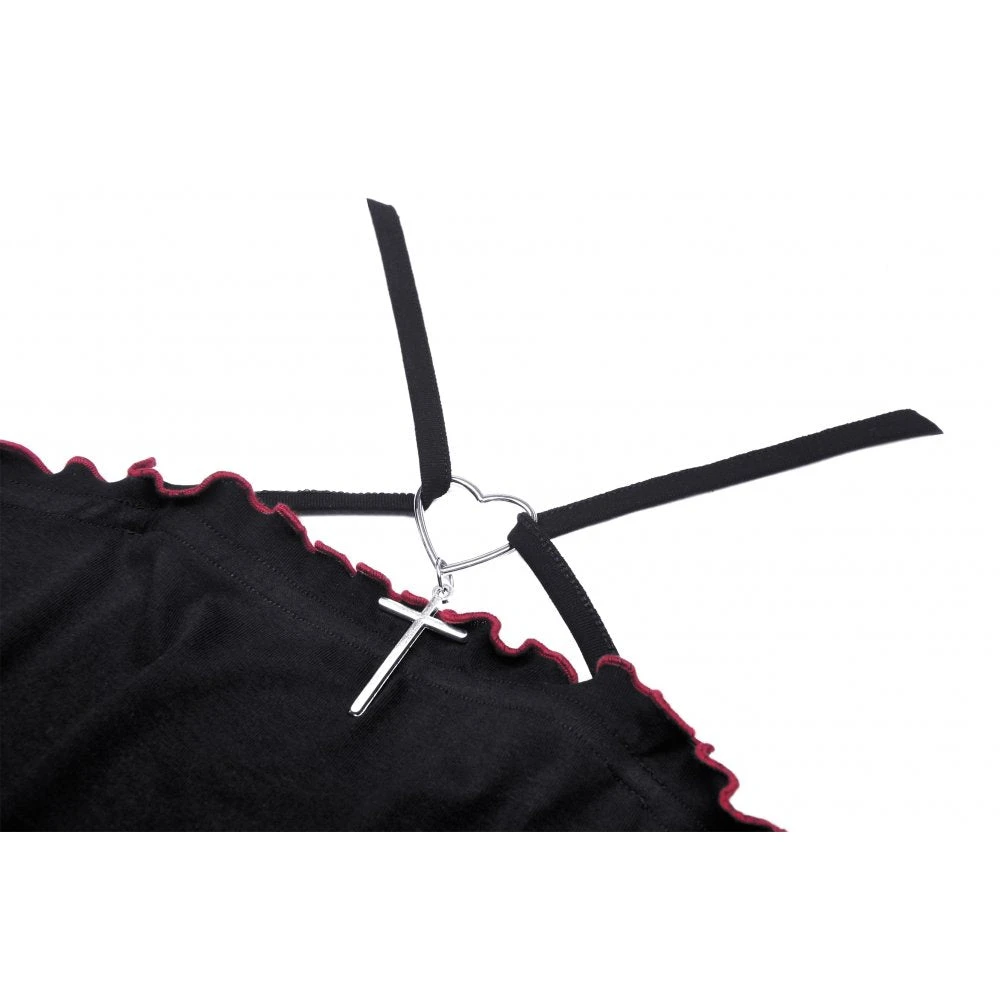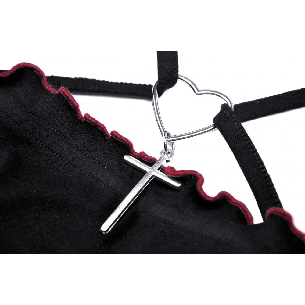 Super cute little cropped top from Dark in Love featuring spaghetti straps with heart & cross pendant and red trim to the ruffled neckline. With corset inspired red lacing and red trimmed mesh accents to the open back, this stunning little top has faux leather red bat wings for that extra something. For the perfect fit and fabric composition, please see Dark in Loves size guide in the images.