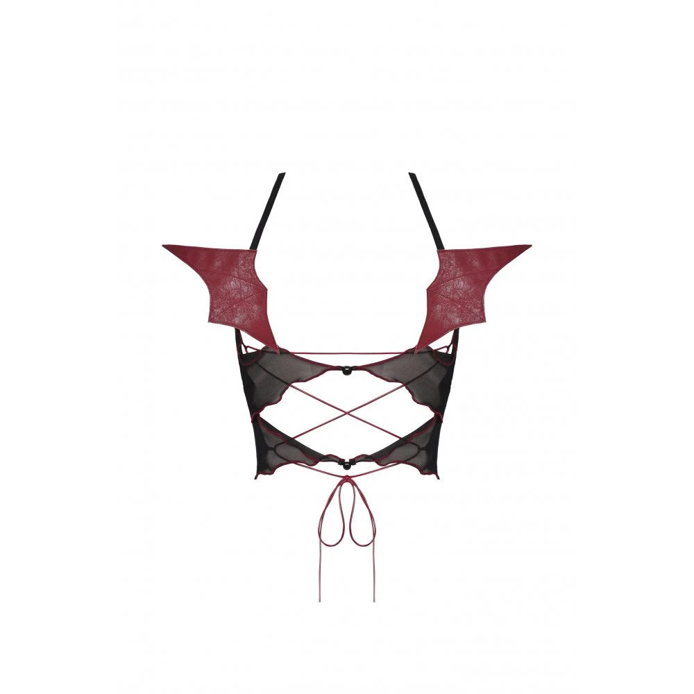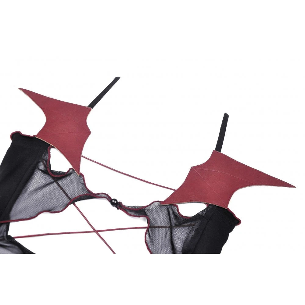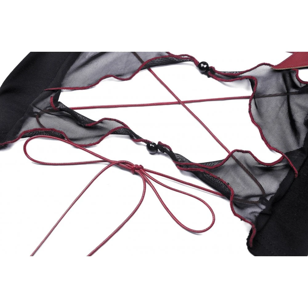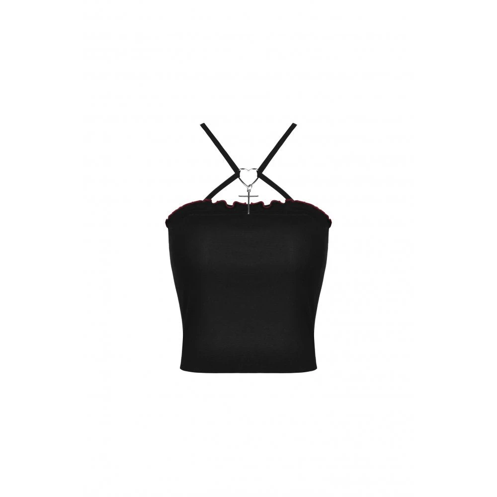 Super cute little cropped top from Dark in Love featuring spaghetti straps with heart & cross pendant and red trim to the ruffled neckline. With corset inspired red lacing and red trimmed mesh accents to the open back, this stunning little top has faux leather red bat wings for that extra something. For the perfect fit and fabric composition, please see Dark in Loves size guide in the images.