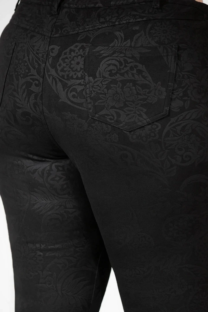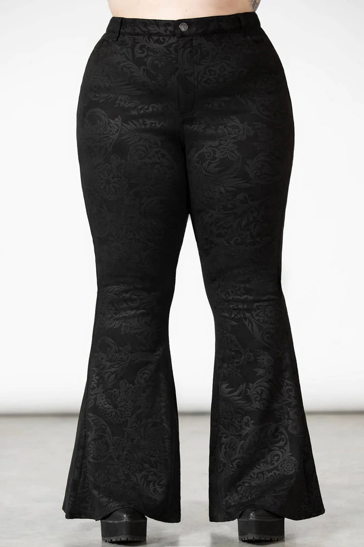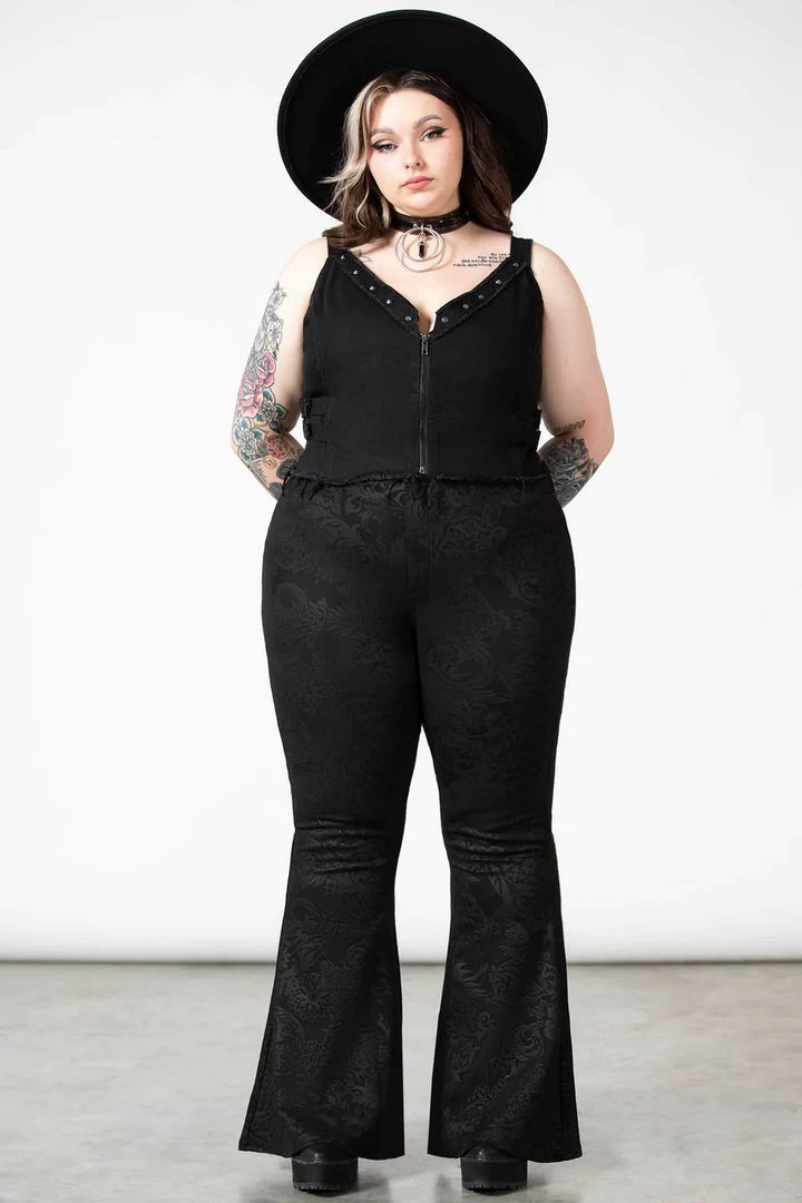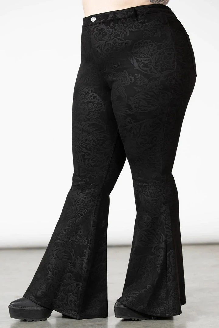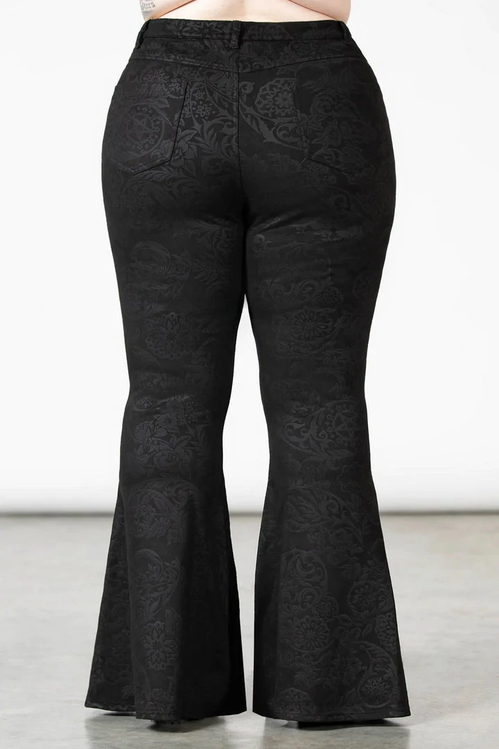 The awesome Black Lily Bell Bottoms from Killstar come in a luxurious embossed faux suede. Fastening with a zip & button, these lovely bell bottoms have a fabulous wide flare and pockets to the back.