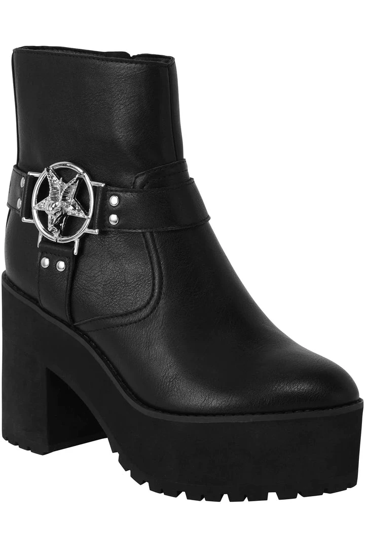 Stunning black platform heel ankle boots by Killstar that are made from vegan leather with a side zip for convenience. These awesome high heeled platform boots will elevate your look with a 10.2cm/4″ heel! These lovely black boots also feature pentagram metal hardware and an extra tall platform for a standout look!