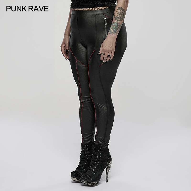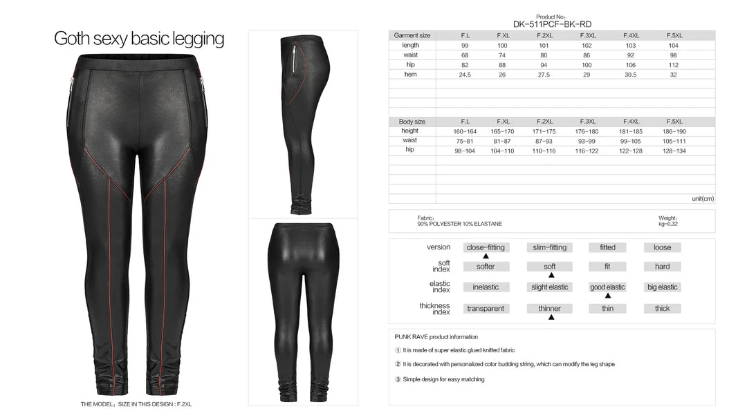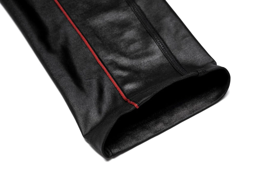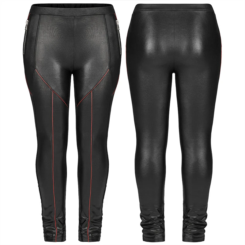 Stunning wet look leggings from Punk Rave featuring decorative zip accents to the sides and contrasting red piping detail. For the perfect fit and fabric composition, please see Punk Rave’s size guide in the images.