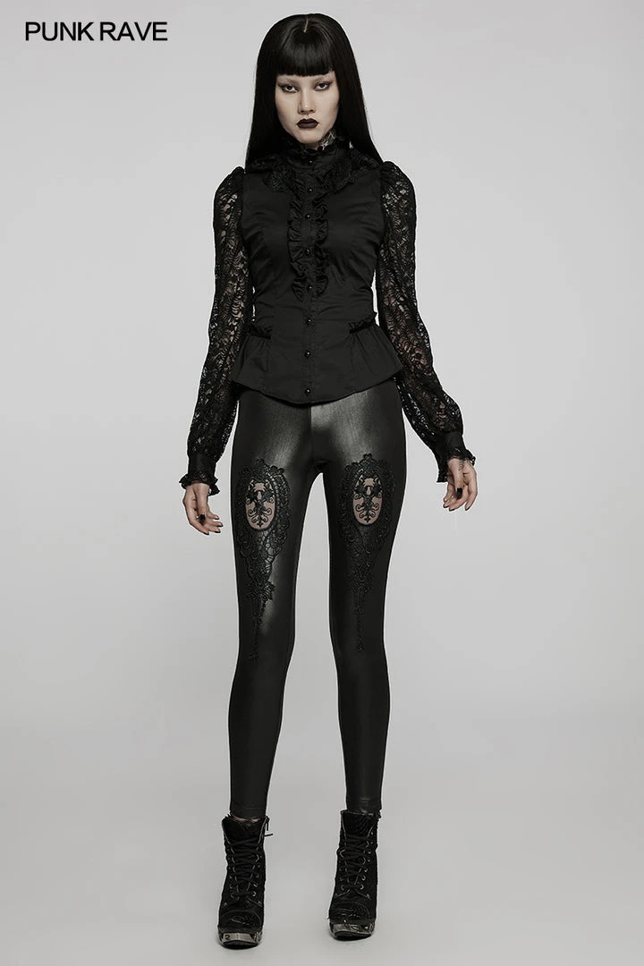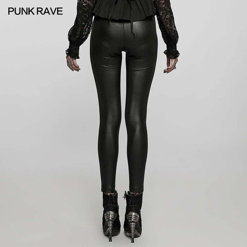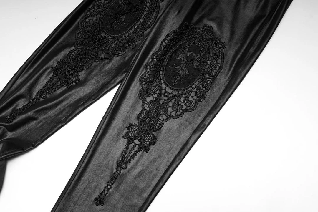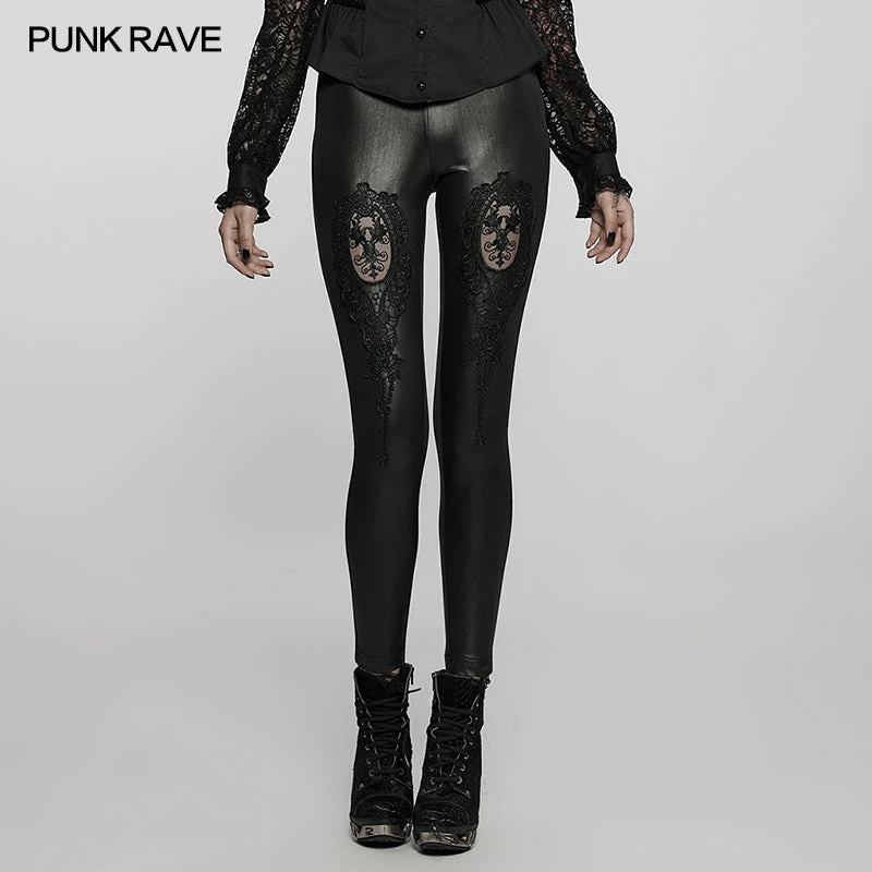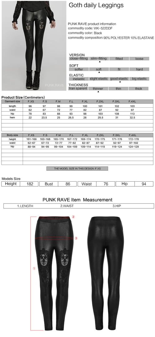 Striking wet look leggings from Punk Rave featuring lace appliques with cut-out detail to the thighs.. For the perfect fit and fabric composition, please see Punk Rave’s size guide in the images.