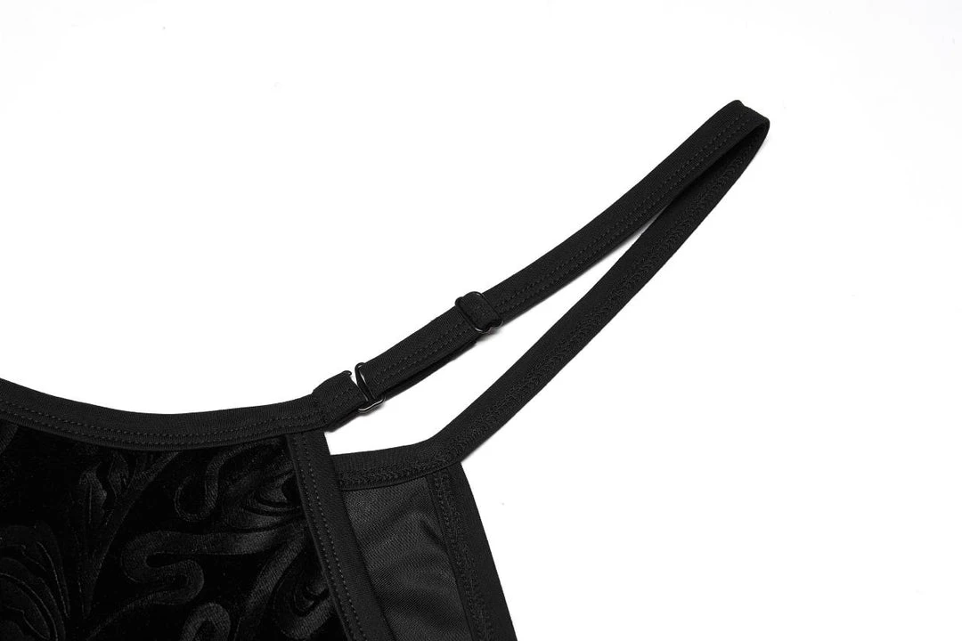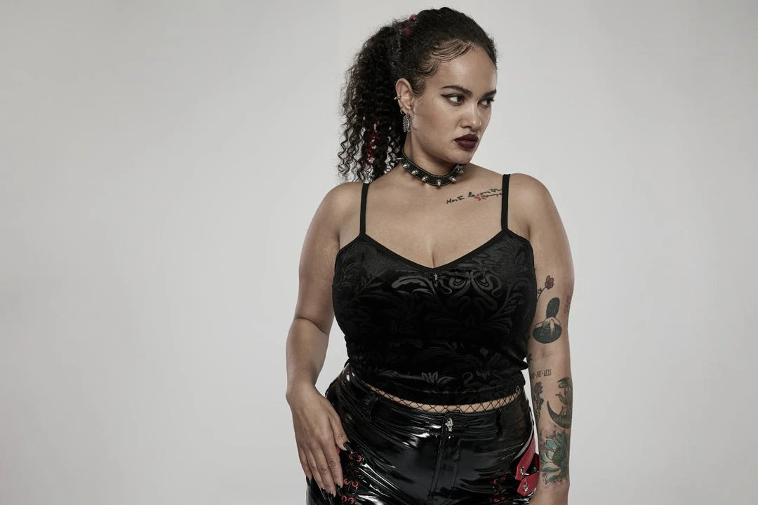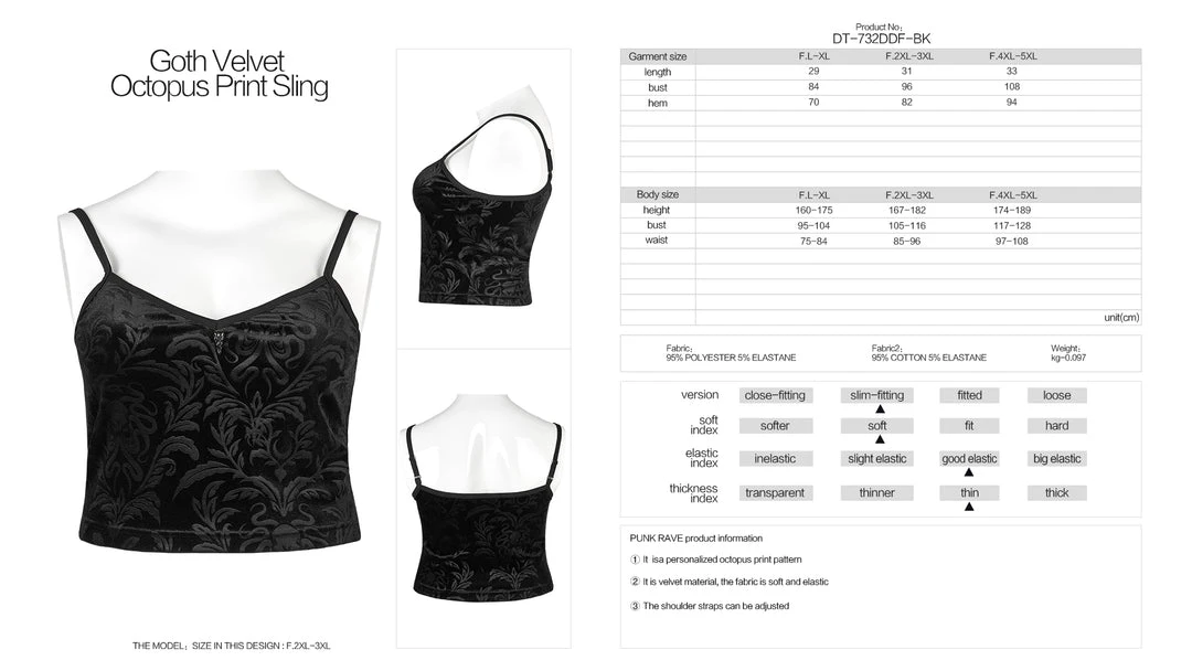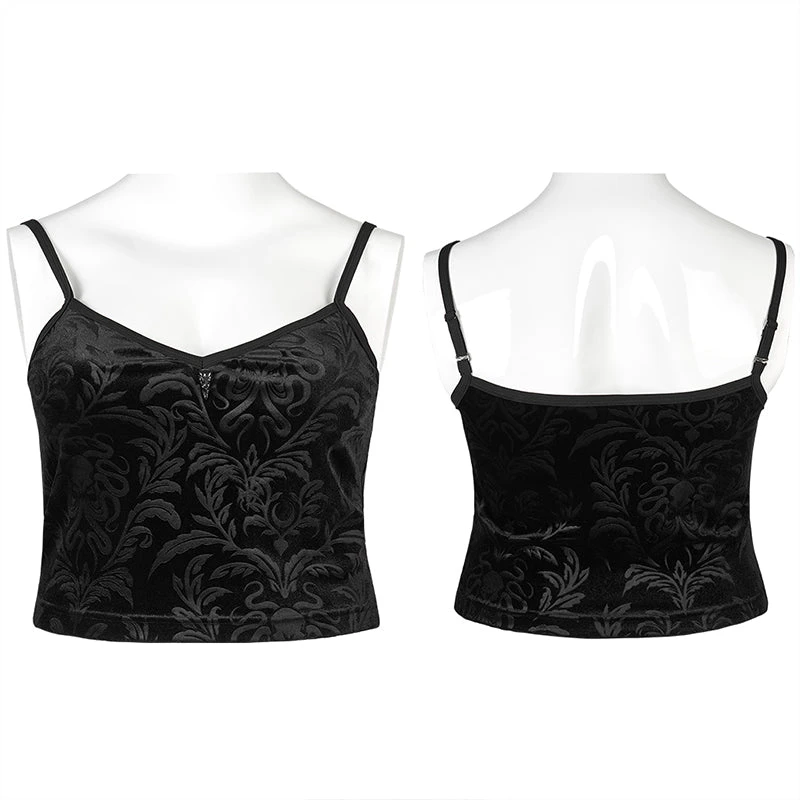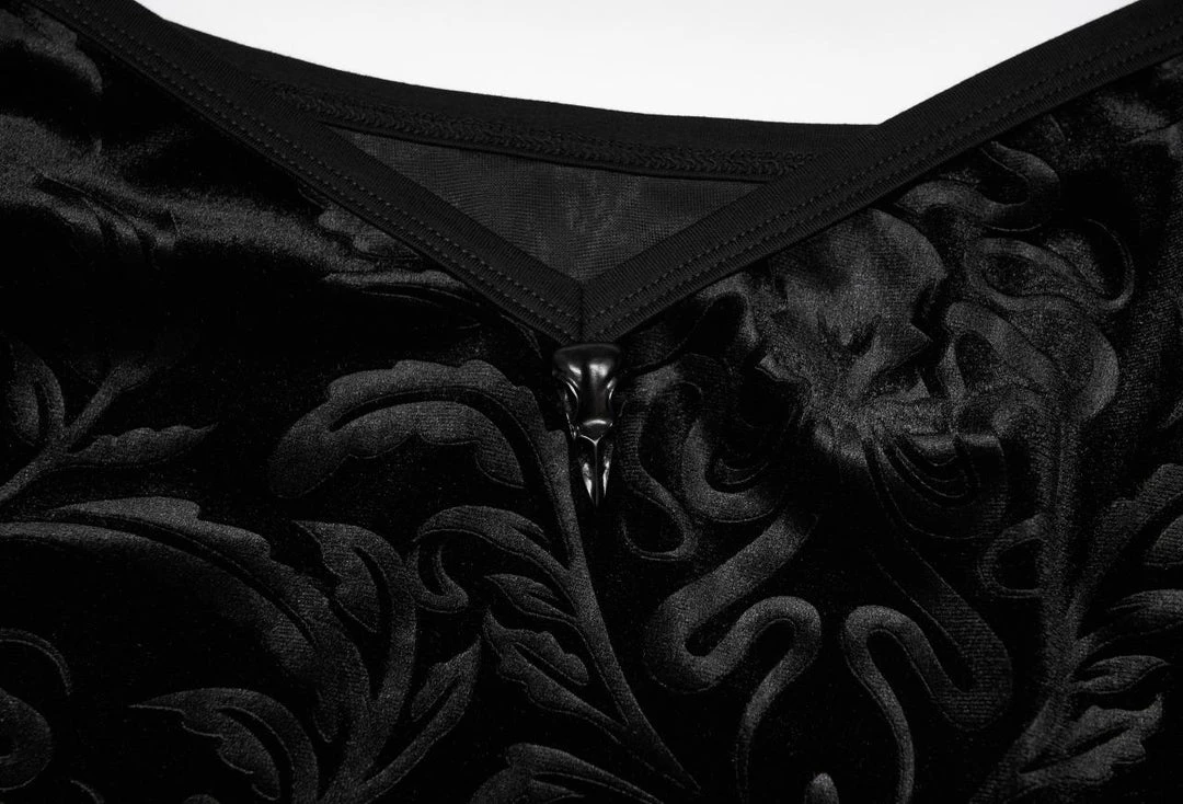 Lovely Cthulhu embossed velvet top from Punk Rave featuring adjustable spaghetti straps and bird skull adornment. For the perfect fit and fabric composition, please see Punk Rave’s size guide in the images.