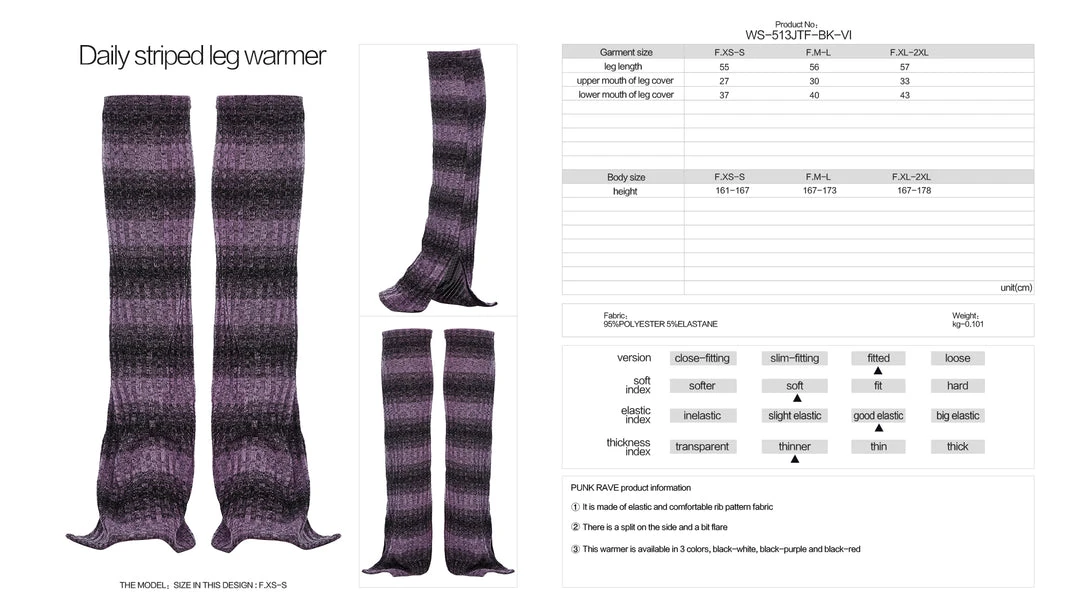 These awesome ribbed leg warmers from Punk Rave come in a black & violet stripe. With splits to the side and a slight flare, these fabulous leg warmers look great on. For the perfect fit and fabric composition, please see Punk Rave’s size guide in the images