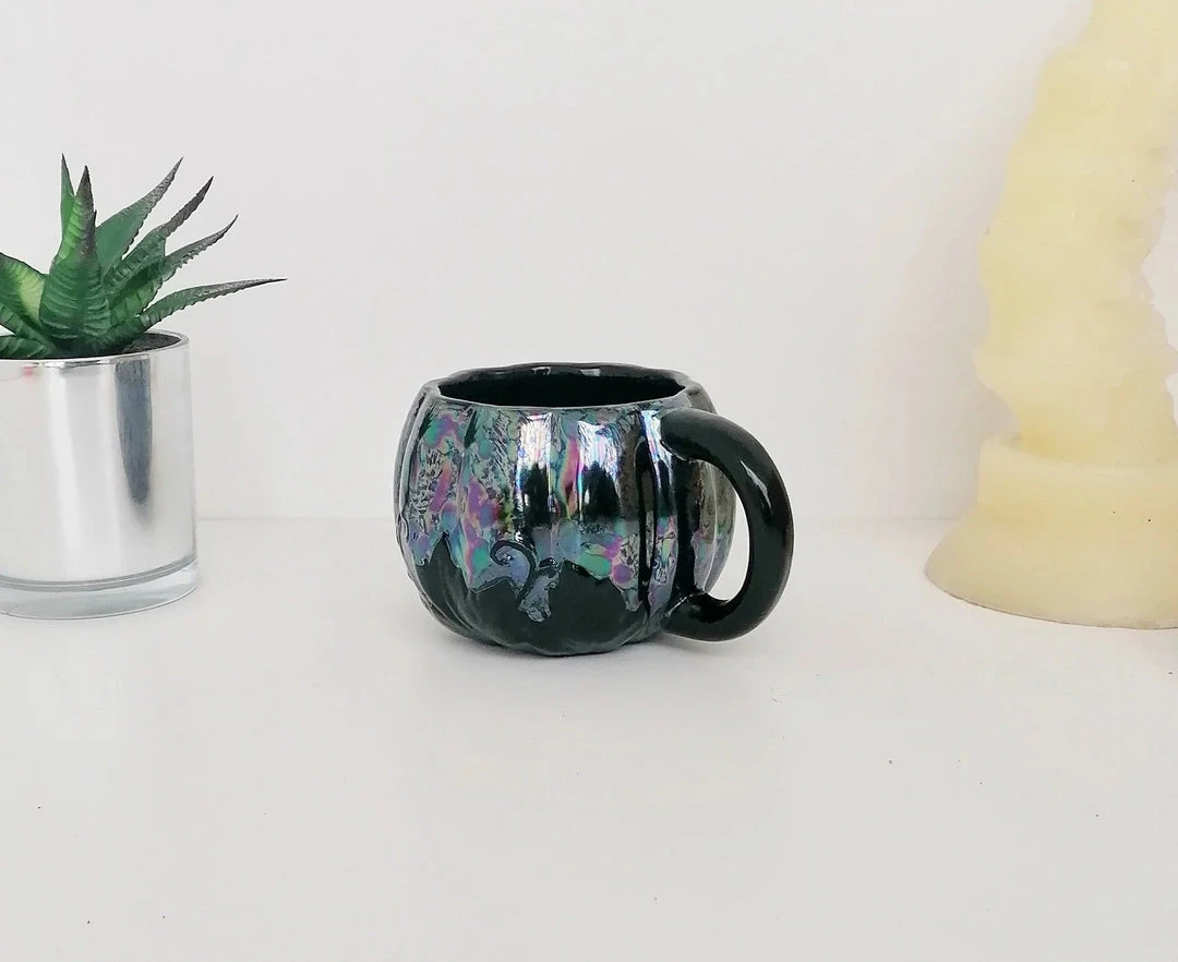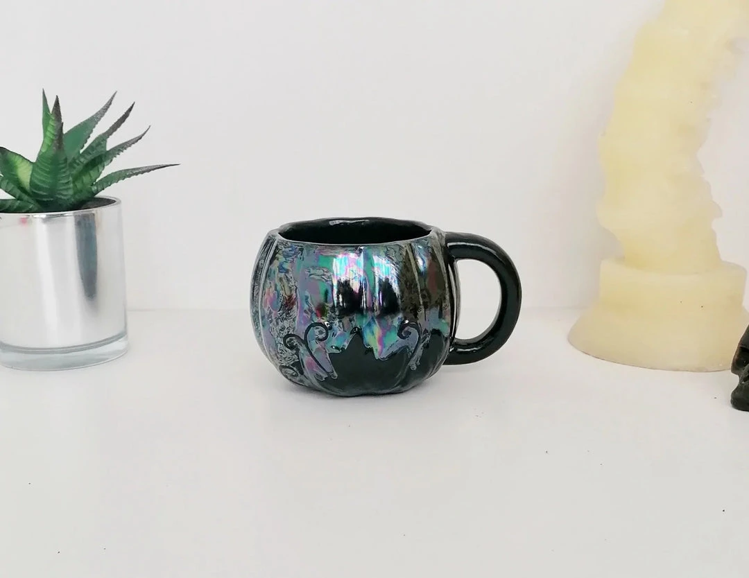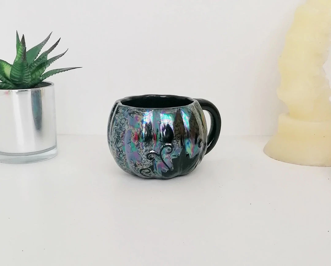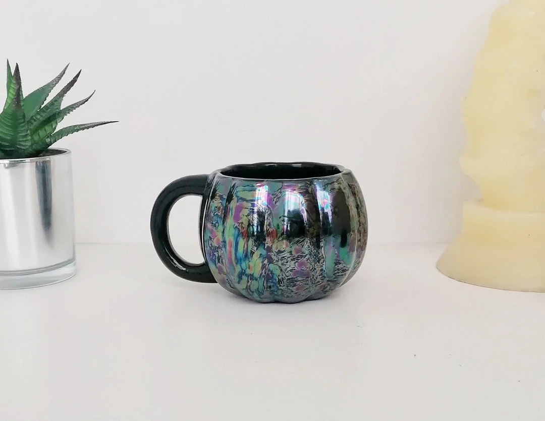 This amazing mug from Weird & Wonderful Ceramics has a pumpkin shape and large handle. With an oil slick glaze and black foliage design, this is the perfect mug for your favourite beverage.
