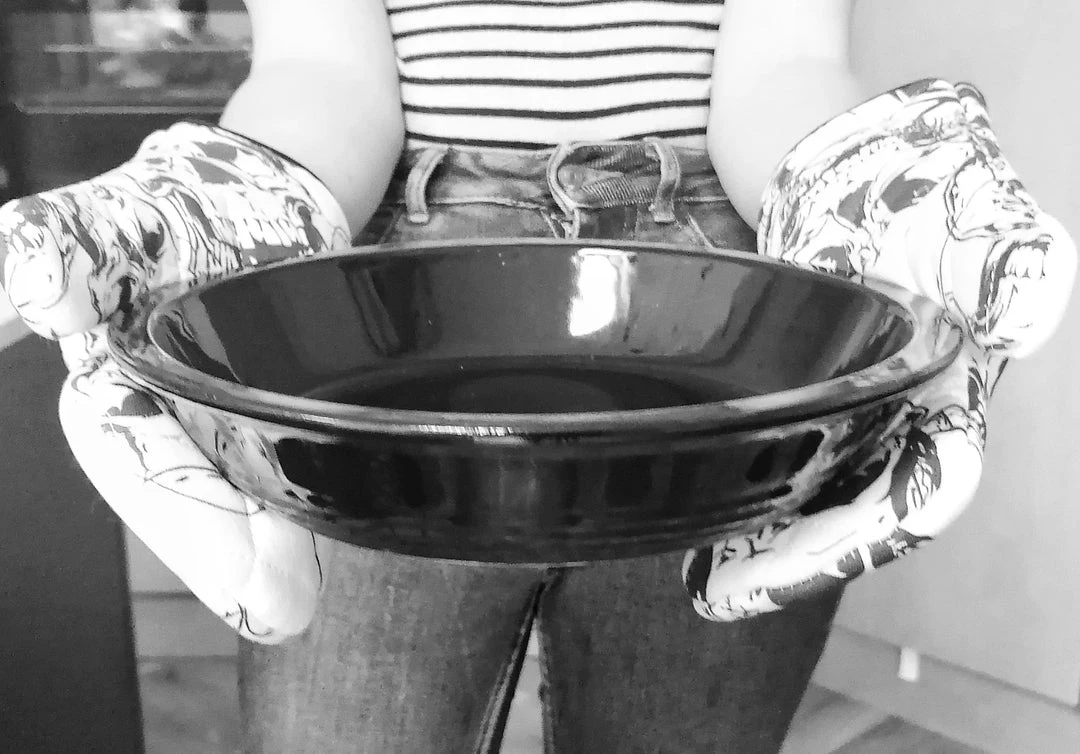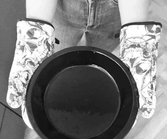 This awesome pair of oven gloves from Weird & Wonderful Ceramics come with one side quilted and have a fabulous black skulls print on 100% white cotton fabric.