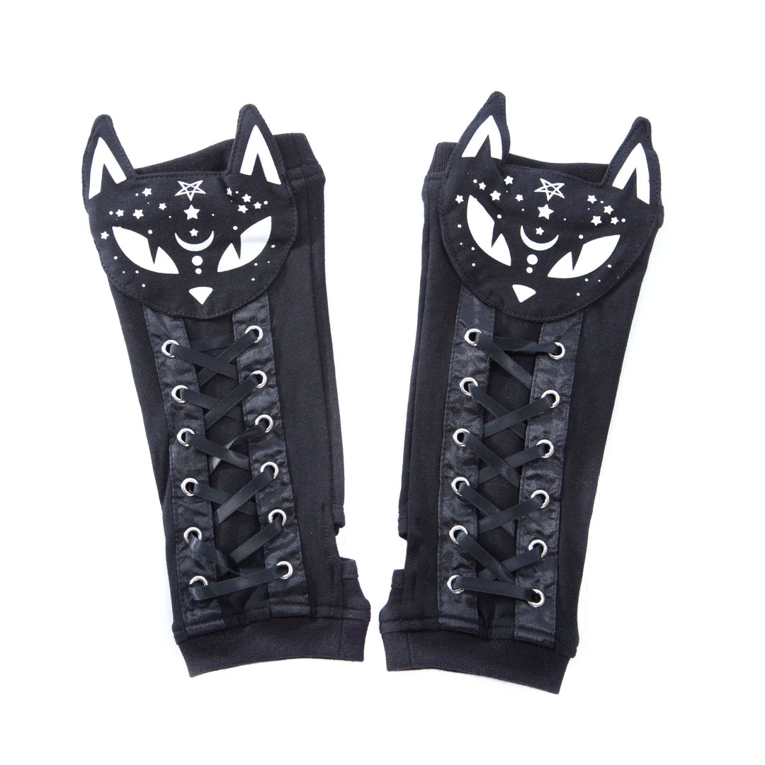Super cute kitty armwarmers from Poizen Industries featuring a fingerless design with thumb hole, ribbon lacing detail and an awesome occult kitty print.
